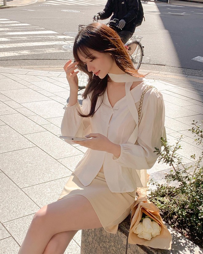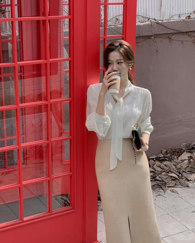 Áo blouse trắng, có chi tiết khăn quàng ghi điểm ở nét sang trọng, yêu kiều. Các nàng không cần phối đồ quá cầu kỳ với mẫu áo này. Sự kết hợp giữa áo blouse trắng với chân váy ngắn màu be sẽ giúp người mặc ghi điểm trang nhã, tinh tế. Để giữ nguyên độ hài hòa của bộ trang phục, các nàng hãy chọn giày dép và túi xách mang tông màu trung tính.