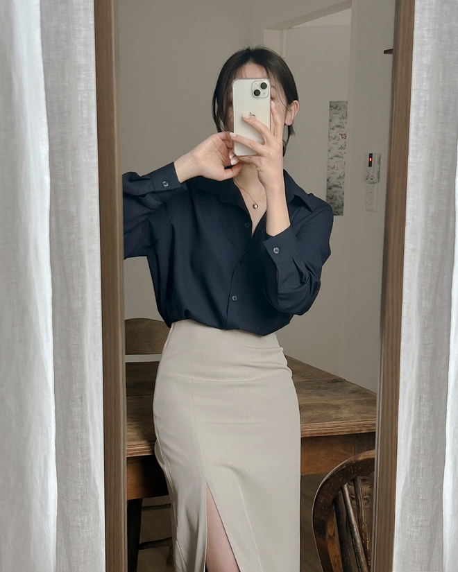Áo sơ mi màu xanh than ghi điểm ở sự sang trọng, trang nhã. Mẫu áo này còn giúp tôn da sáng hơn, ai cũng có thể mặc đẹp. Công thức áo sơ mi xanh than và chân váy màu trắng kem tạo nên bộ trang phục thanh lịch, hiện đại, thích hợp để diện đến công sở.