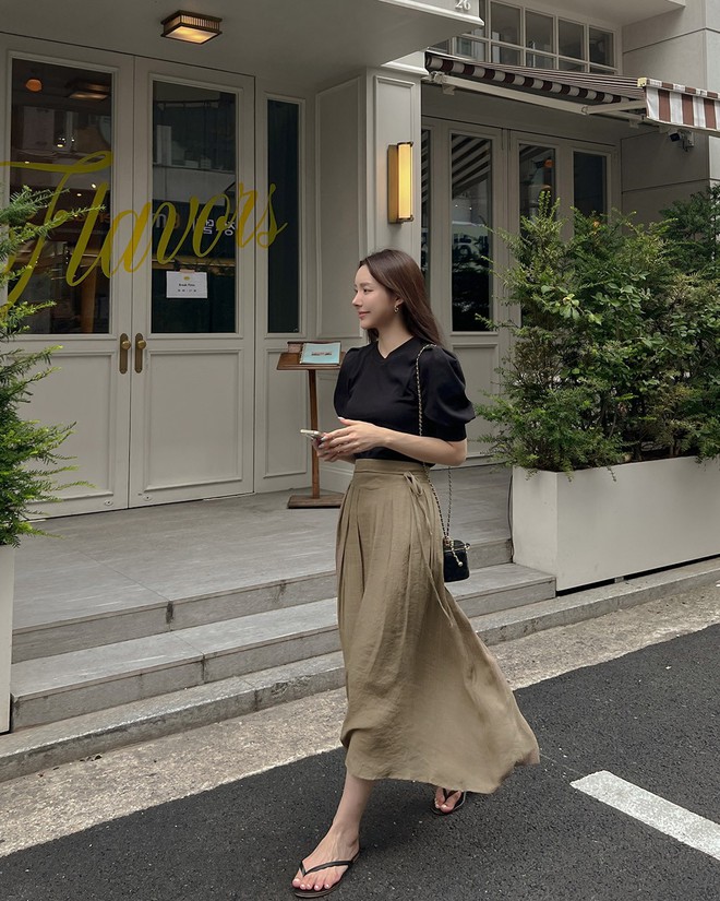 Đơn giản nhưng vẫn cuốn hút là ấn tượng về outfit gồm áo blouse tay bồng, tông màu đen và chân váy vải thô. Chị em nên sơ vin vì thao tác này không chỉ giúp tôn dáng tối ưu, mà còn nâng tầm phong cách. Bên cạnh dép xỏ ngón, các nàng có thể chọn những mẫu giày như sandal, giày mule hoặc giày búp bê để hoàn thiện set áo blouse, chân váy dài.