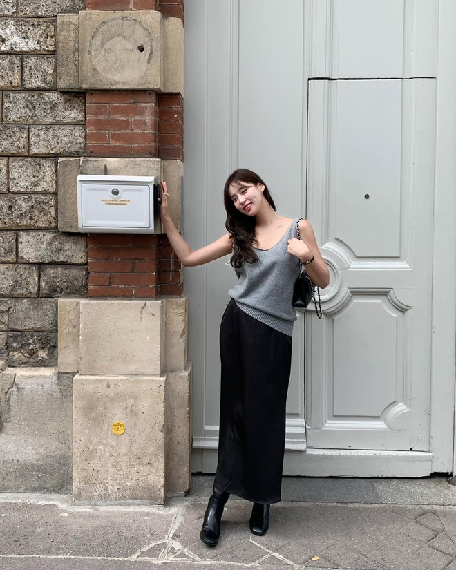 Ngay cả khi áp dụng cách phối đồ tối giản, chị em vẫn có vẻ ngoài rất thời thượng, nổi bật. Bí kíp ở đây chính là kết hợp áo len gile với chân váy suông. Bộ trang phục này "cool ngầu" nhưng không kém phần nữ tính. Đôi boots đen giúp tổng thể outfit trở nên ấn tượng hơn.