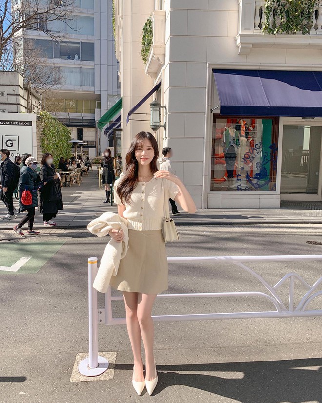 Áo cardigan cộc tay thích hợp để diện trong những ngày mát mẻ. Chị em hãy kết hợp mẫu áo này cùng chân váy ngắn tông màu be, giày cao gót mũi nhọn để có được bộ trang phục tôn dáng tối ưu. Ngoài ra, combo áo cardigan và chân váy ngắn còn ghi điểm trẻ trung, ngọt ngào, chị em nên ghim nếu muốn "hack" tuổi.