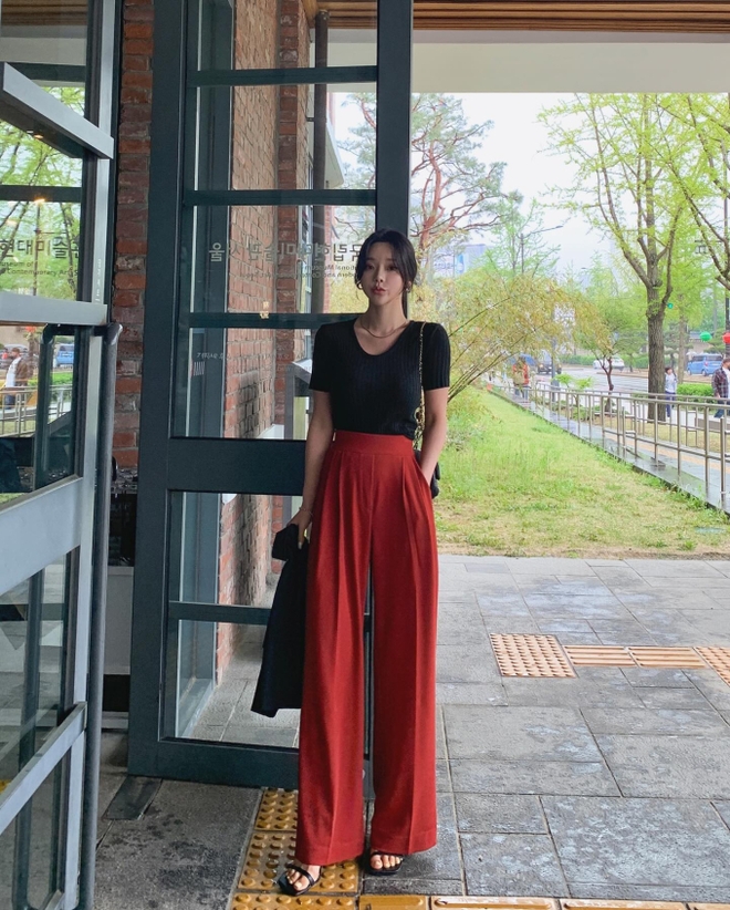 Quần âu màu đỏ đậm chính là điểm nhấn của bộ trang phục trên. Sự kết hợp giữa quần màu đỏ đậm và áo dệt kim màu đen giúp người mặc có được vẻ ngoài thanh lịch, sang trọng. Outfit này còn tôn da sáng hồng rạng rỡ. Thay vì diện giày cao gót mũi nhọn, chị em hãy đi sandal để tổng thể trang phục trở nên trẻ trung, phóng khoáng hơn.