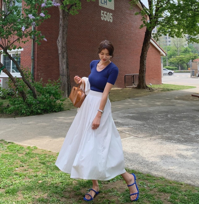 Áo dệt kim đang phổ biến trong thời gian gần đây. Ngay cả khi mang màu sắc nổi bật như xanh dương, áo dệt kim vẫn mang đến sự trang nhã, sang xịn mịn cho người mặc. Sự kết hợp giữa áo dệt kim màu xanh dương và chân váy dài đã tạo nên bộ trang phục nữ tính, bay bổng. Tông màu trắng của chân váy dài còn có tác dụng cân bằng tổng thể outfit.
