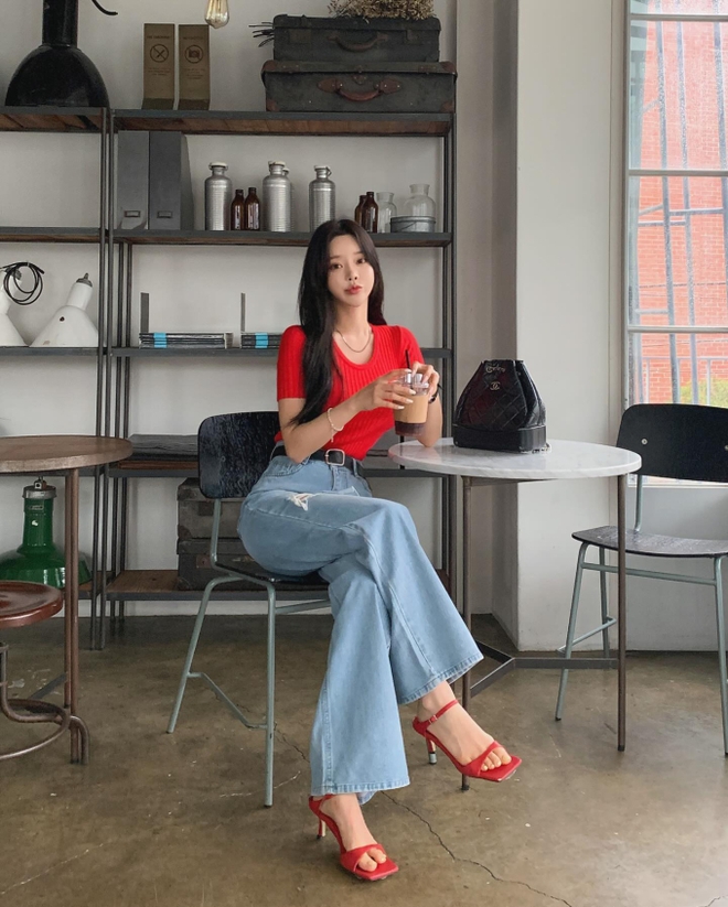 Chị em hãy nắm bắt xu hướng thời trang mùa hè với set đồ gồm áo dệt kim màu đỏ, quần jeans ống rộng và sandal cao gót quai ngang. Bộ trang phục trên rất nổi bật, trẻ trung và còn có sự thanh lịch nhờ thao tác sơ vin, chiếc thắt lưng da tông màu đen.