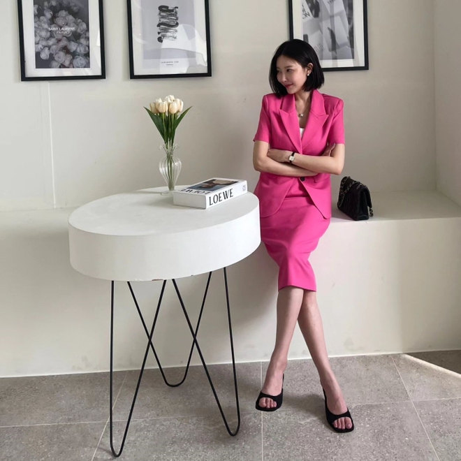 Bộ suit váy màu hồng đậm ghi điểm ở sự sang trọng, nữ tính, đồng thời giúp vẻ ngoài thêm nổi bật. Set trang phục trên còn rất tôn dáng nhờ thiết kế áo blazer gọn gàng, chân váy bút chì dài đến bắp chân. Bộ trang phục trở nên hài hòa hơn nhờ túi xách, giày dép màu đen và chiếc áo trắng layer bên trong.