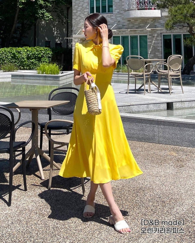 Nàng công sở sẽ có vẻ ngoài rực rỡ, trẻ trung khi diện mẫu váy mang màu vàng tươi trên đây. Để tạo sự hài hòa cho bộ cánh, chị em nên chọn túi xách và giày dép màu trắng khi hoàn thiện outfit. Chi tiết nhấn eo của mẫu váy giúp tăng thêm sự chỉn chu và tôn dáng cao ráo, thon thả.