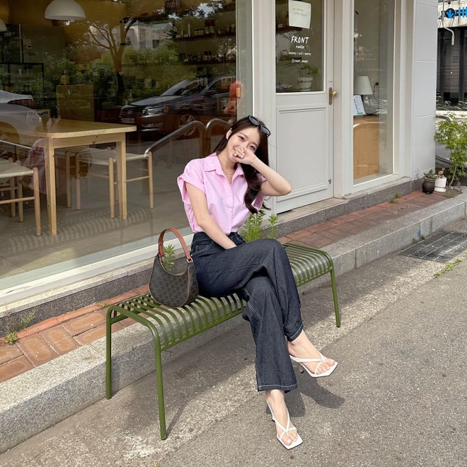 Một trong những cách đơn giản để chinh phục những chiếc áo sơ mi hồng pastel chính là kết hợp với quần đen. Công thức này hài hòa nhưng vẫn đảm bảo sự nổi bật, trẻ trung. Đôi sandal cao gót rất tinh tế và mang đến hiệu quả kéo chân thon dài.