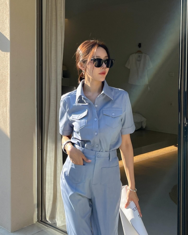 Set áo vest cộc tay và quần âu có sự đứng dáng, chuyên nghiệp. Dẫu vậy, bộ đồ trông vẫn trẻ trung, ngọt ngào nhờ tông màu pastel làm chủ đạo. Để không tạo cảm giác rối mắt cho tổng thể outfit, chị em nên chọn giày dép và túi xách tông màu trung tính.