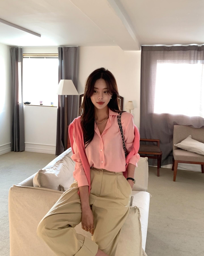 Công thức áo sơ mi màu hồng pastel và quần màu be không chỉ trẻ trung mà còn ghi điểm trang nhã, tinh tế. Các nàng đừng quên tô điểm một số món phụ kiện cho bộ đồ như vòng cổ ngọc trai, dây chuyền dáng mảnh hoặc khuyên tai để diện mạo thêm long lanh, sang trọng.