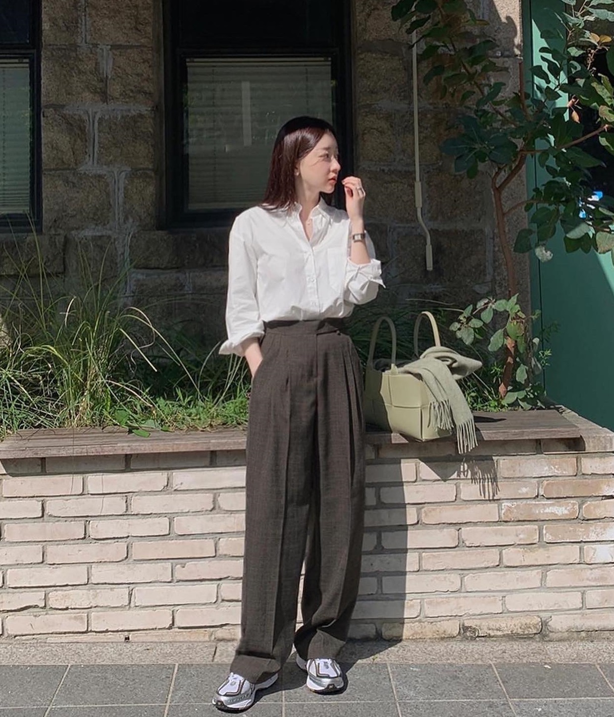 Công thức áo trắng và quần âu gây ấn tượng ở sự dịu dàng, trang nhã nhưng không hề cộng tuổi cho người mặc. Mẫu áo có độ dài ngang hông sẽ giúp "hack" dáng hiệu quả mà không cần sơ vin. Đôi giày hai tông màu đã tăng vẻ tinh tế, sang trọng cho tổng thể trang phục.