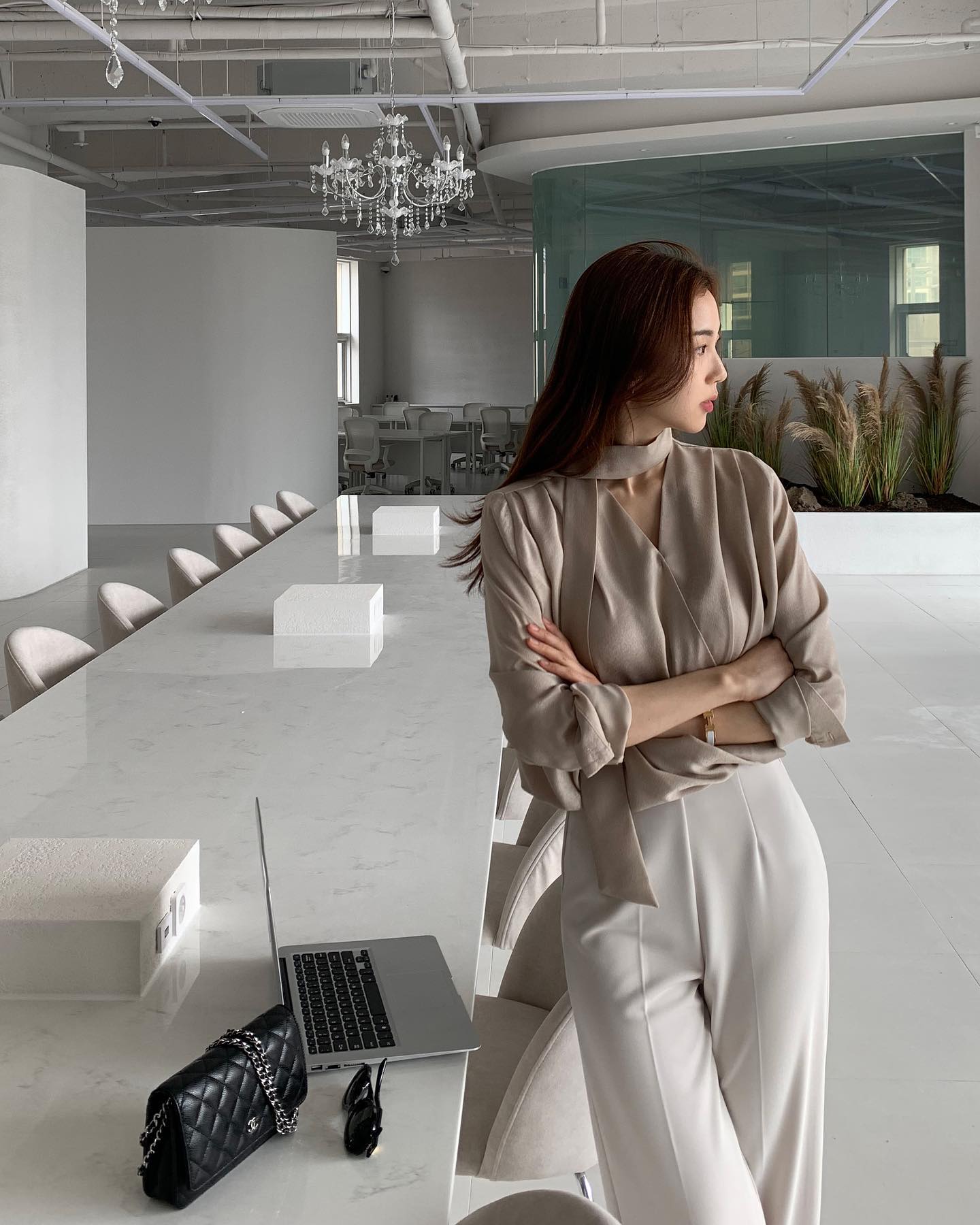 Dù mang tông màu trung tính làm chủ đạo, bộ trang phục trên vẫn nổi bật nhờ mẫu áo blouse vải lụa, có thêm chi tiết khăn quàng dáng mảnh. Khi kết hợp áo blouse vải lụa với quần âu trắng, vẻ ngoài của người diện trở nên trẻ trung, tươi tắn hơn. Nếu sơ vin gọn gàng, tổng thể trang phục sẽ thêm sang trọng, yêu kiều.