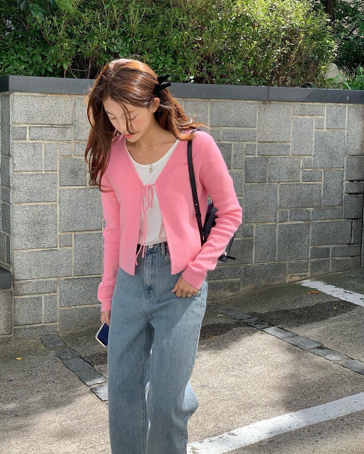 Một chiếc áo dây buộc tông màu hồng pastel khoác ngoài đã tạo điểm nhấn cho bộ đôi áo thun trắng + quần jeans xanh vốn rất đơn giản. Thao tác sơ vin và mẫu áo dáng ngắn còn cho hiệu quả "ăn gian" chiều cao. Đây là lựa chọn thời trang hoàn hảo cho những buổi dạo phố cuối tuần.