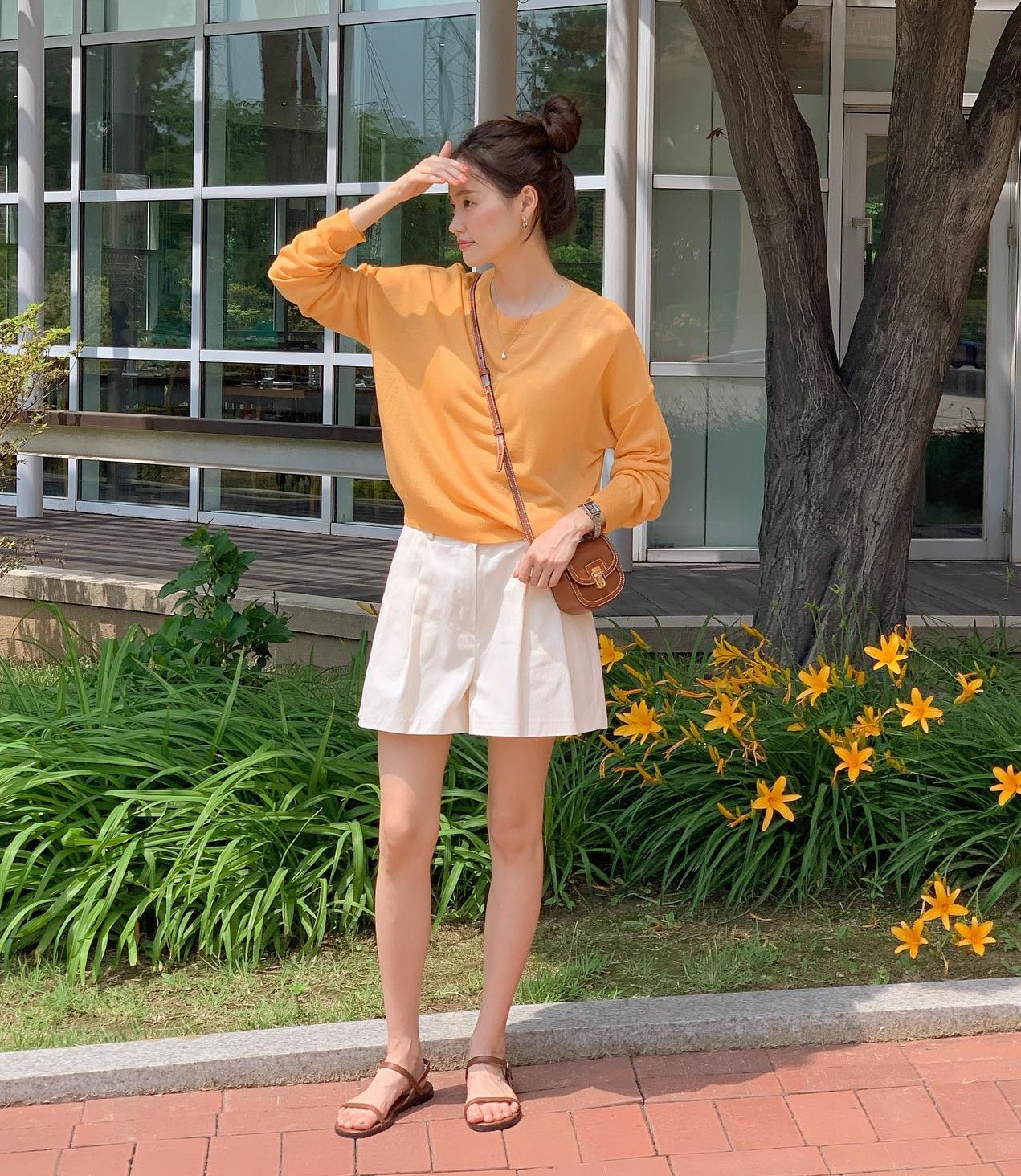 Màu cam pastel gây ấn tượng ở sự rạng rỡ, tươi tắn. Khi kết hợp mẫu áo này với quần short trắng và sandal, bạn có được bộ trang phục rất trẻ trung, năng động. Chiếc túi xách tông màu nâu đã tăng vẻ tinh tế cho tổng thể set đồ.