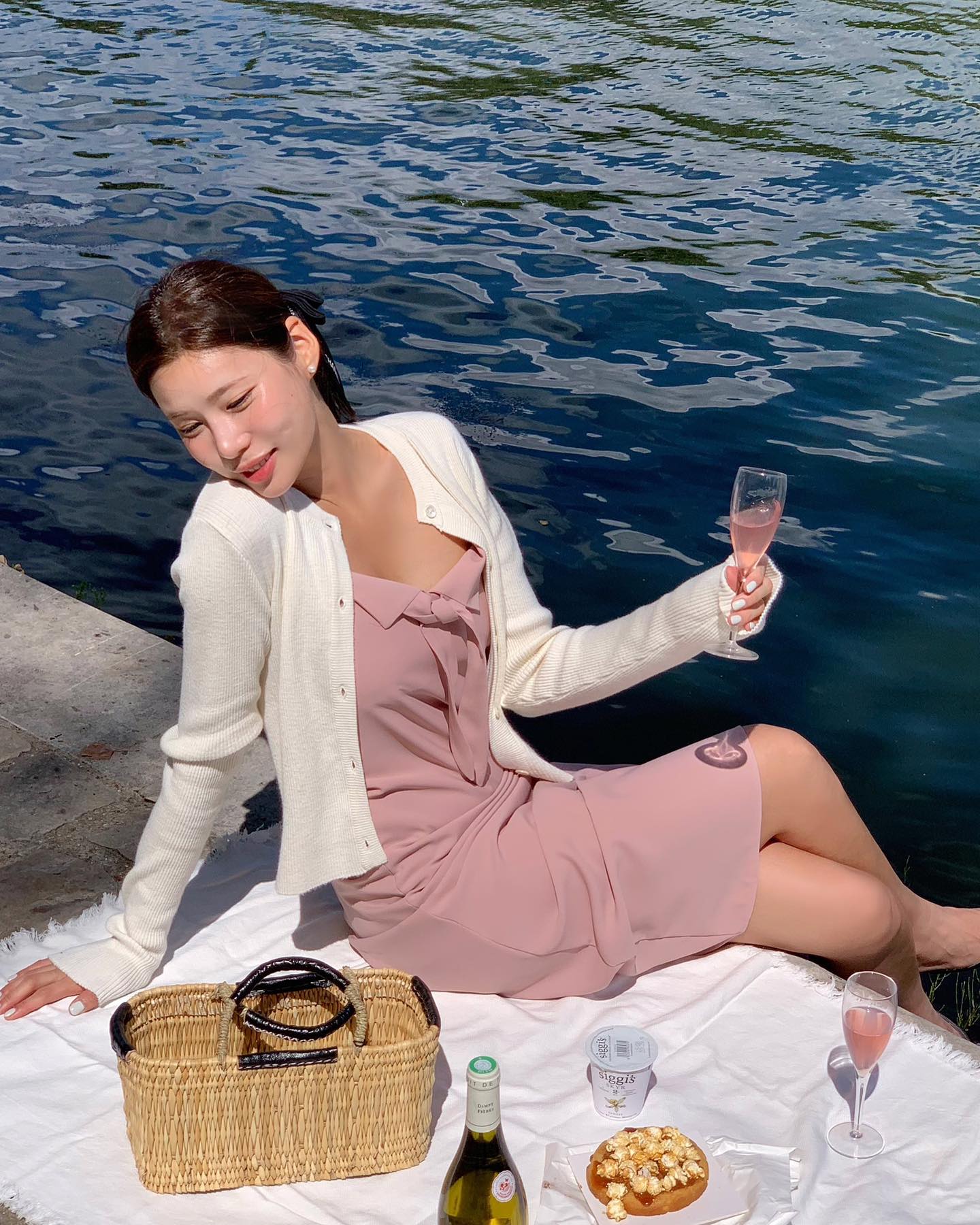 Váy hồng pastel và cardigan trắng tạo nên tổng thể trang phục ngọt ngào, bay bổng. Đây cũng là ý tưởng giúp bạn có được những tấm hình "sống ảo" thật hút mắt. Muốn hoàn thiện set trang phục đẹp mắt, chị em hãy ưu tiên các kiểu giày như giày búp bê nơ mảnh, giày Mary Jane hoặc sandal dáng mule.