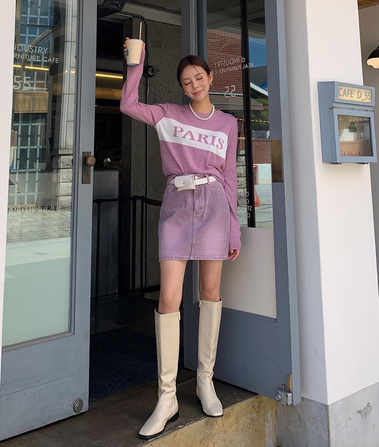 Dù diện cả cây đồ tím, các nàng cũng không lo vẻ ngoài trở nên "sến sẩm" nếu ưu tiên tông tím pastel. Mẫu áo họa tiết và chiếc chân váy ngắn đã nhân đôi hiệu quả trẻ hóa phong cách. Đôi boots cao cổ, tông màu trắng không chỉ cộng thêm điểm sang trọng mà còn có công dụng cân bằng set đồ.