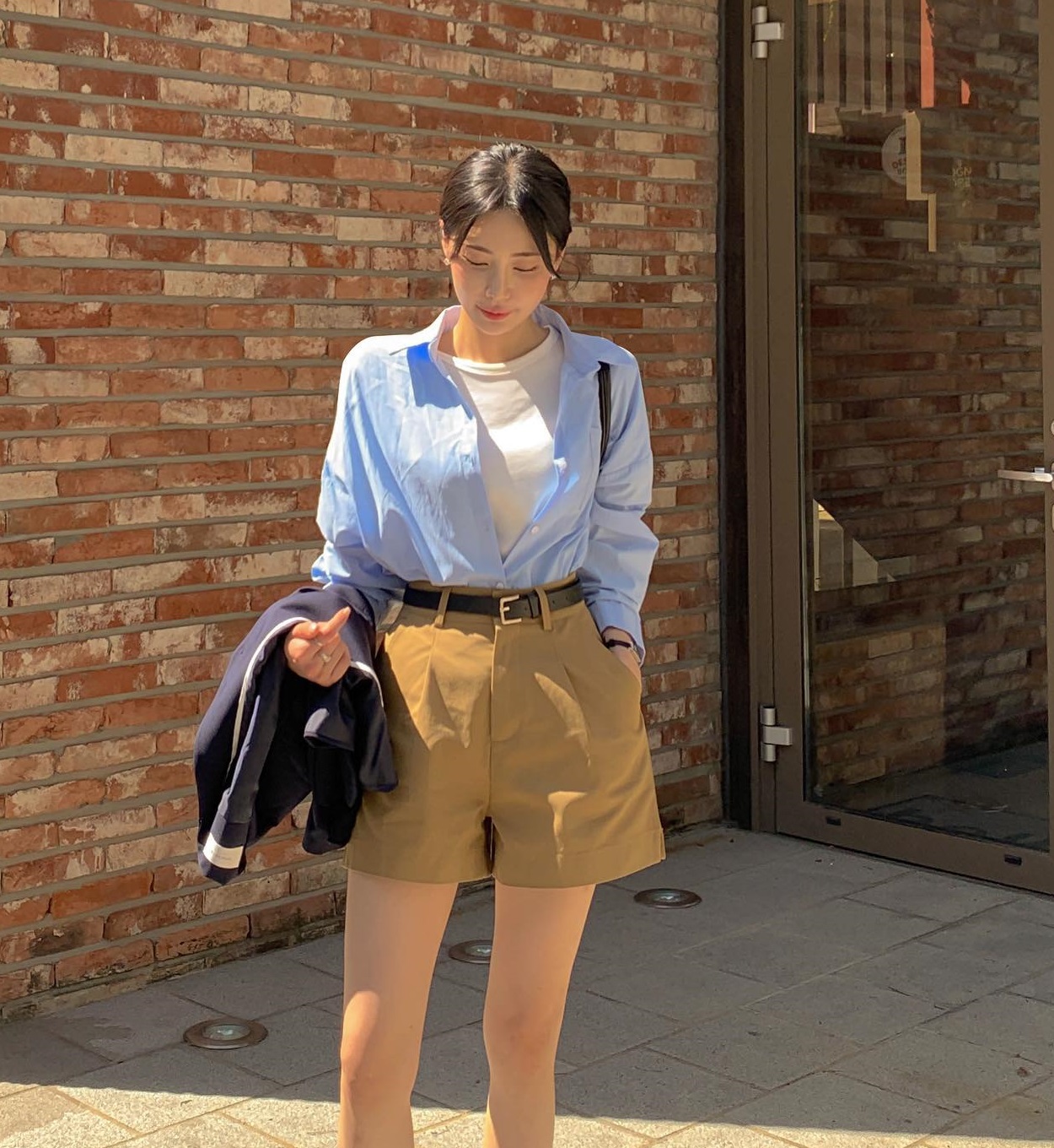 Vào những ngày trời không quá lạnh, bạn có thể tái chế những chiếc áo sơ mi của mùa hè. Khi kết hợp áo sơ mi xanh pastel với áo thun, quần short màu be, các nàng sẽ tạo nên bộ trang phục trẻ trung, năng động. Bên cạnh đó, set đồ cũng gây ấn tượng ở sự thanh lịch nhờ thao tác sơ vin, cùng chiếc thắt lưng màu trung tính.