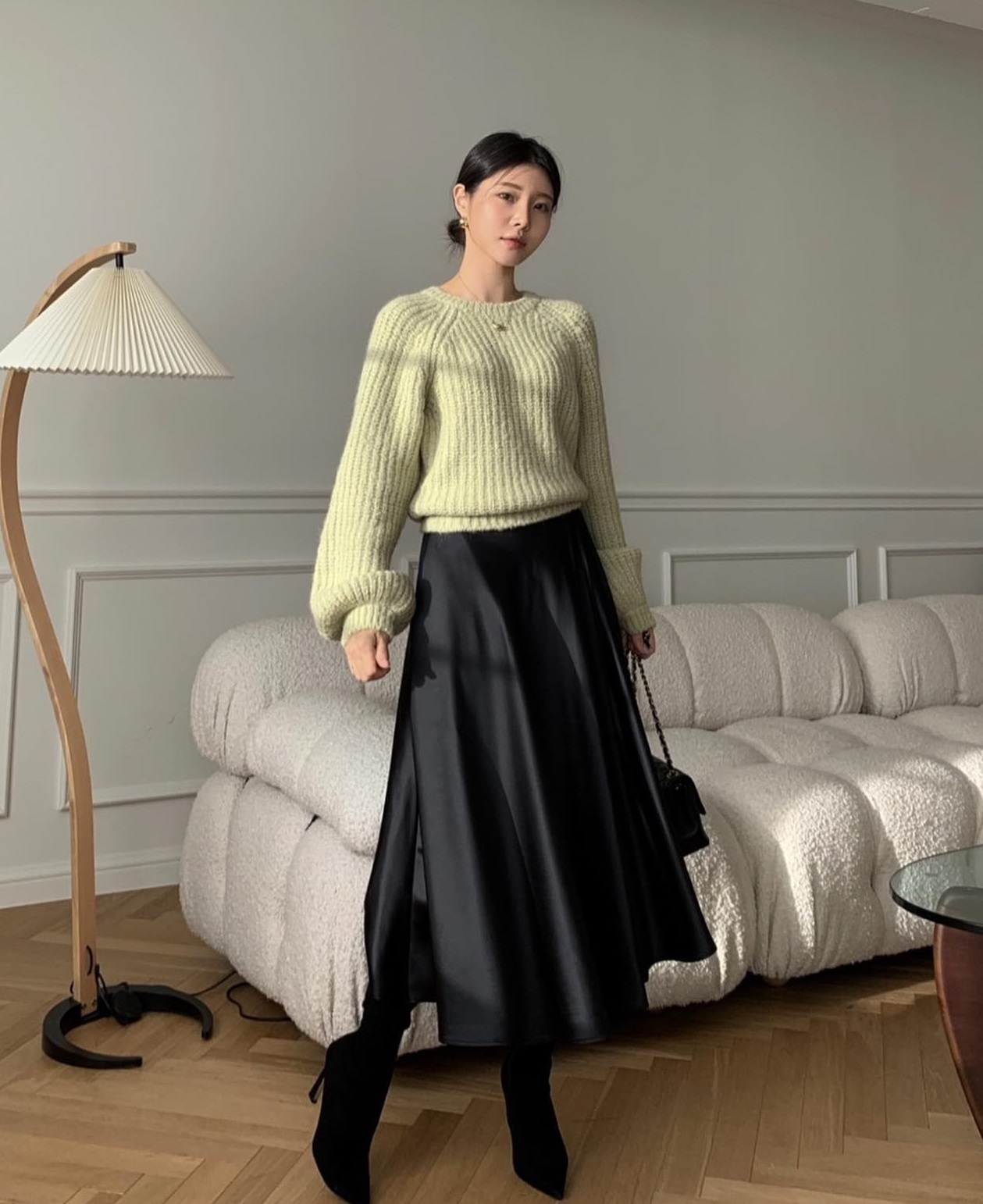 Chị em nên tham khảo set áo len màu xanh lá nhạt và chân váy chữ A, tông màu đen cho mùa đông năm nay. Set đồ này rất trẻ trung, nhưng vẫn có sự trang nhã và thanh lịch. Do đó, chị em có thể diện bộ cánh này tới công sở.