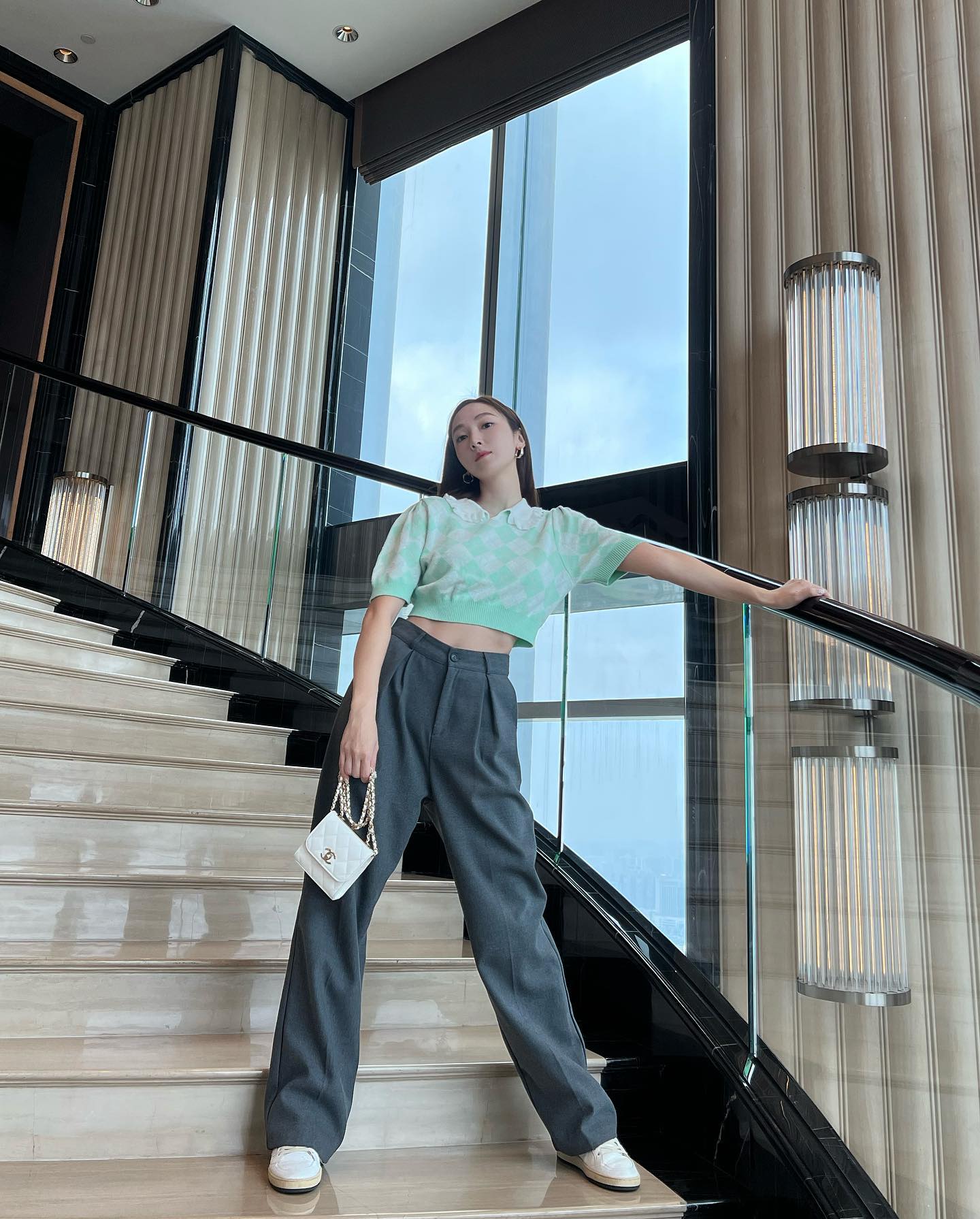 Chiếc áo họa tiết, mang tông màu pastel của Jessica vốn bắt mắt nên cô kết hợp với quần âu xám đơn giản, từ đó tạo nên outfit hài hòa, đẹp mắt. Thiết kế áo lửng còn giúp "ăn gian" chiều cao hiệu quả. Đôi sneaker trắng rất phù hợp với bộ cánh trẻ trung, năng động.