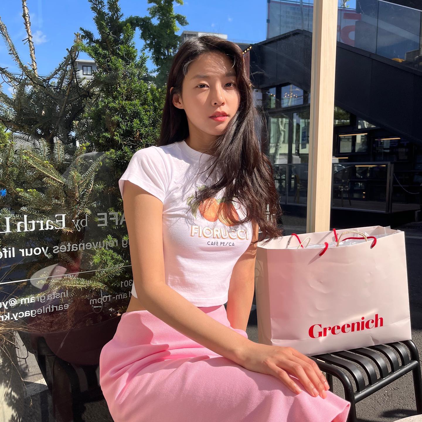 Seolhyun gợi ý cho chị em bộ cánh trẻ trung và quyến rũ bao gồm áo thun ôm dáng, chân váy hồng pastel. Bộ trang phục này rất nổi bật nhưng vẫn có sự hài hòa. Set đồ là ý tưởng đáng tham khảo cho những chuyến du lịch mùa hè.