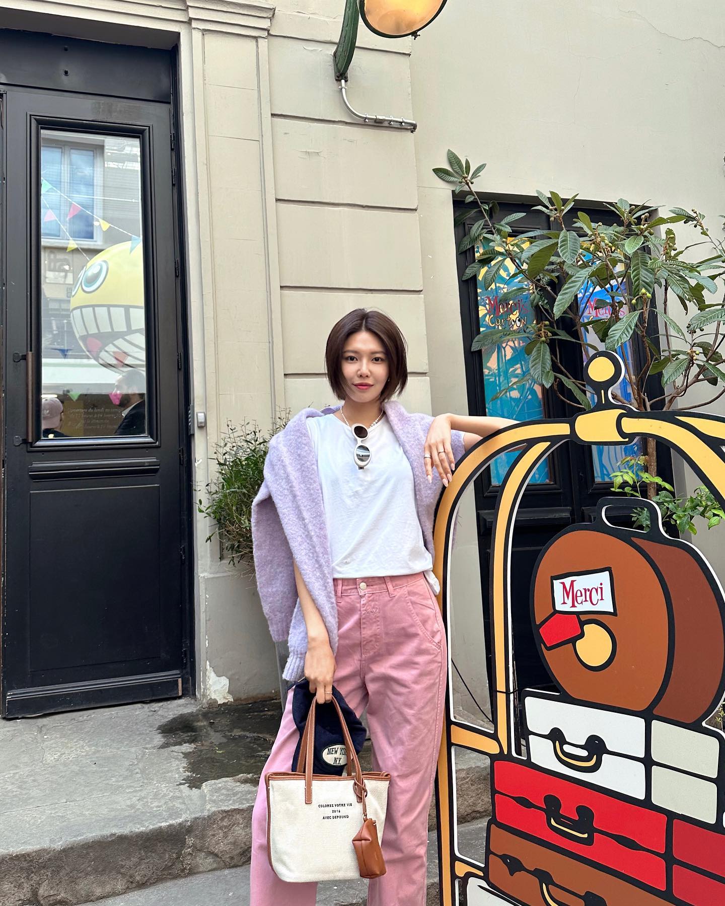 Công thức áo thun trắng và quần ống suông màu pastel không tiêu tốn nhiều thời gian, công sức phối đồ. Bộ trang phục này mang đến sự trẻ trung, tươi mới cho người diện. Sooyoung còn giúp tổng thể outfit thêm nổi bật nhờ tô điểm vòng cổ ngọc trai và áo len quàng vai tông màu tím pastel.