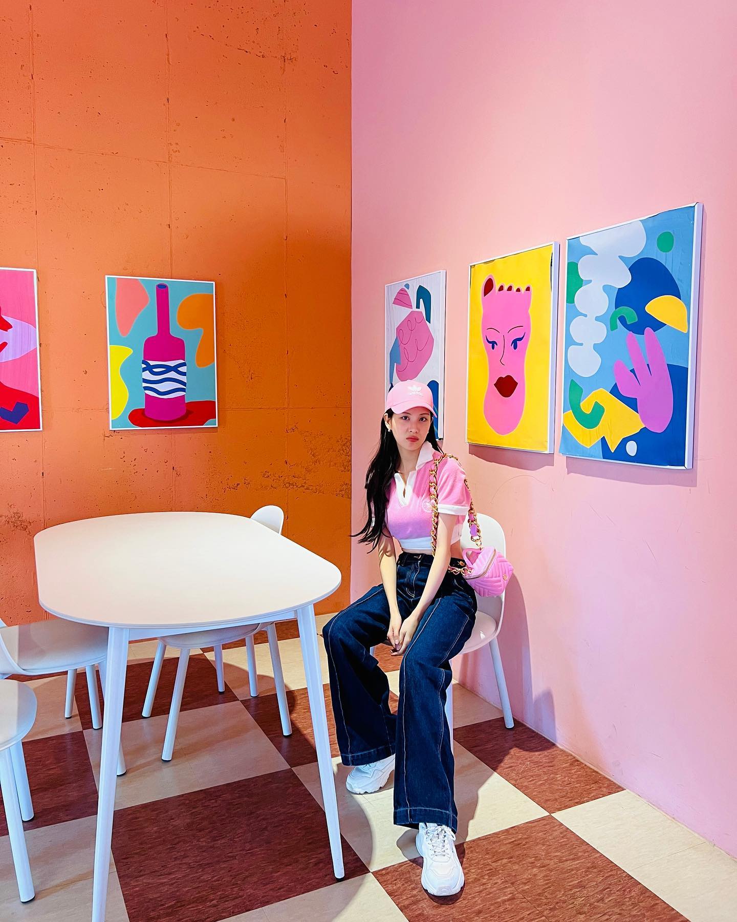 Seohyun toát lên nét năng động, trẻ trung khi diện công thức áo crop top màu hồng và quần denim xanh thẫm. Các món đồ như mũ lưỡi trai, giày sneaker trắng là những mảnh ghép hoàn hảo của outfit trên.