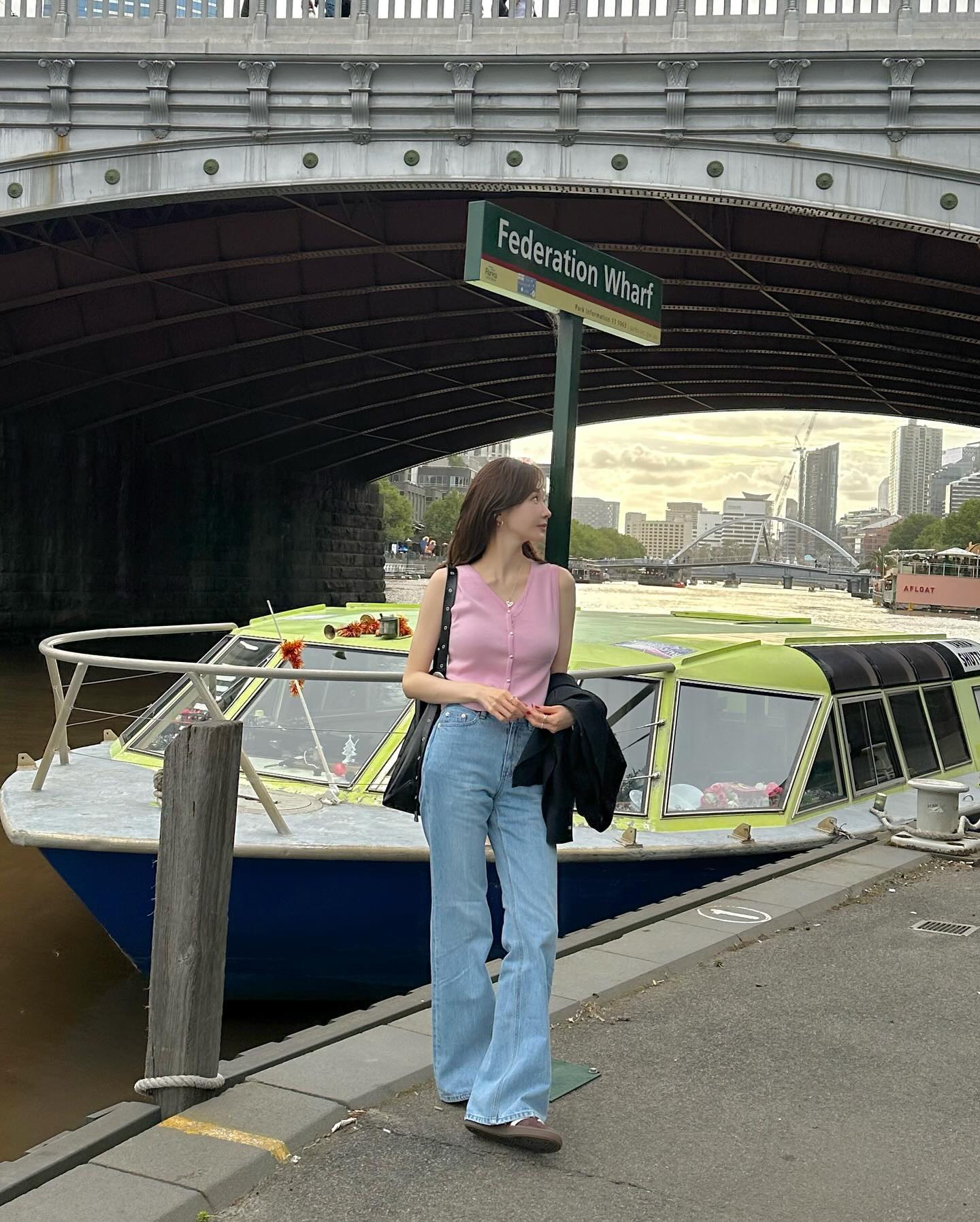 Set đồ gồm áo gile màu hồng pastel và quần jeans xanh của Kang Min Kyung (nhóm Davichi) rất dễ áp dụng. Công thức này cho hiệu quả "hack" tuổi nhưng vẫn ghi điểm tinh tế, sang trọng. Bên cạnh giày thể thao, các nàng có thể đi sandal, giày mule hoặc giày búp bê đơn giản để hoàn thiện outfit.
