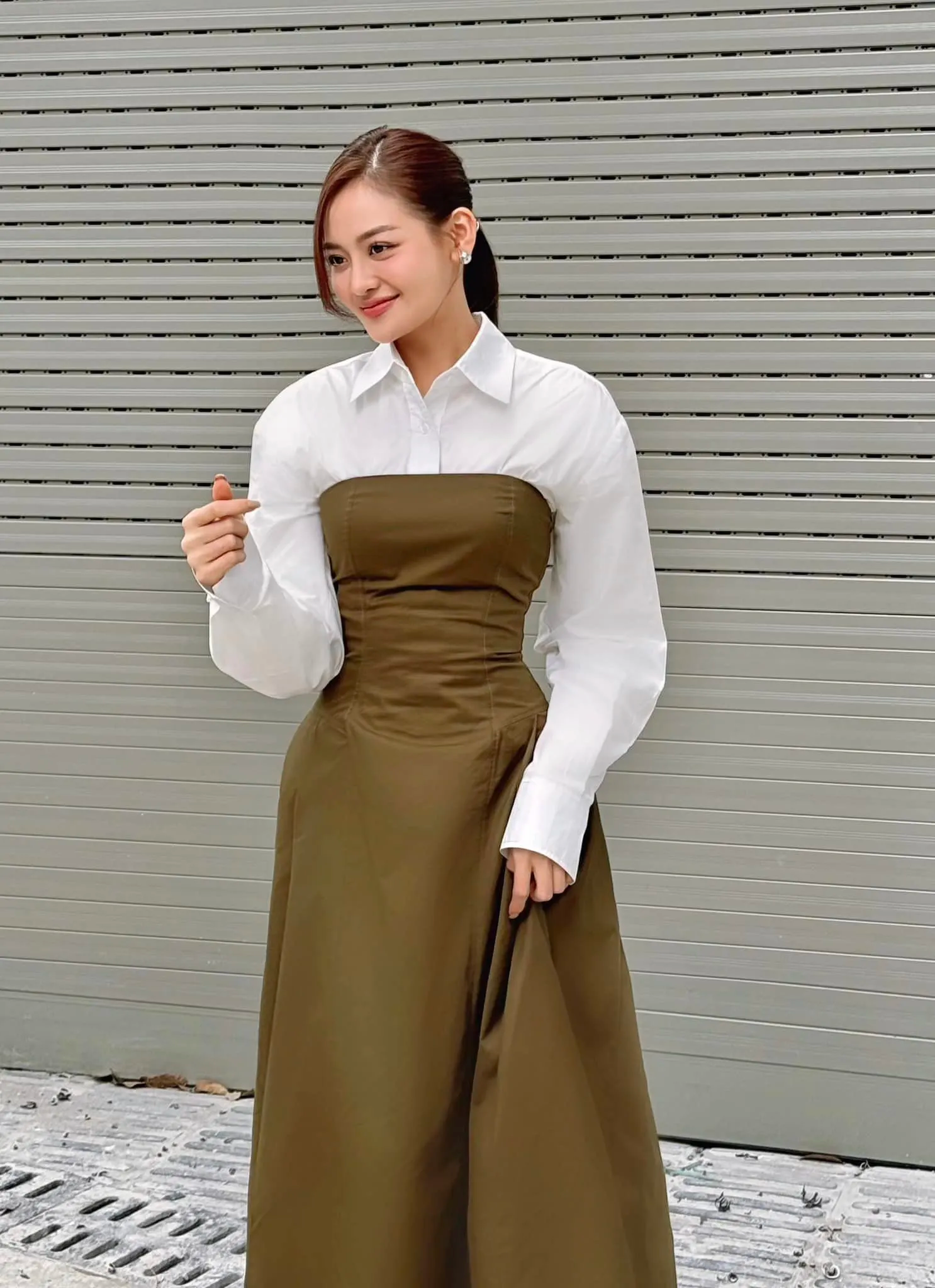 Không thể thiếu công thức sơ mi mix cùng quần hay chân váy cạp cao trong danh sách những chiêu mix đồ hack dáng của Thùy Anh trong phim. Đôi khi chỉ là chiếc áo sơ mi trắng đơn giản diện cùng chân váy midi, cô nàng đã mang đến một set đồ đẹp, tinh tế trong mọi hoàn cảnh.