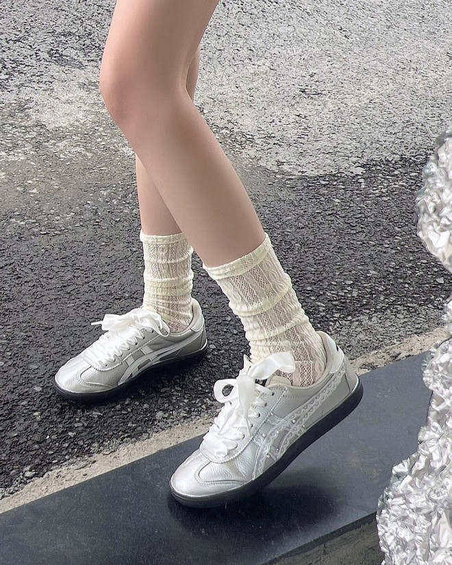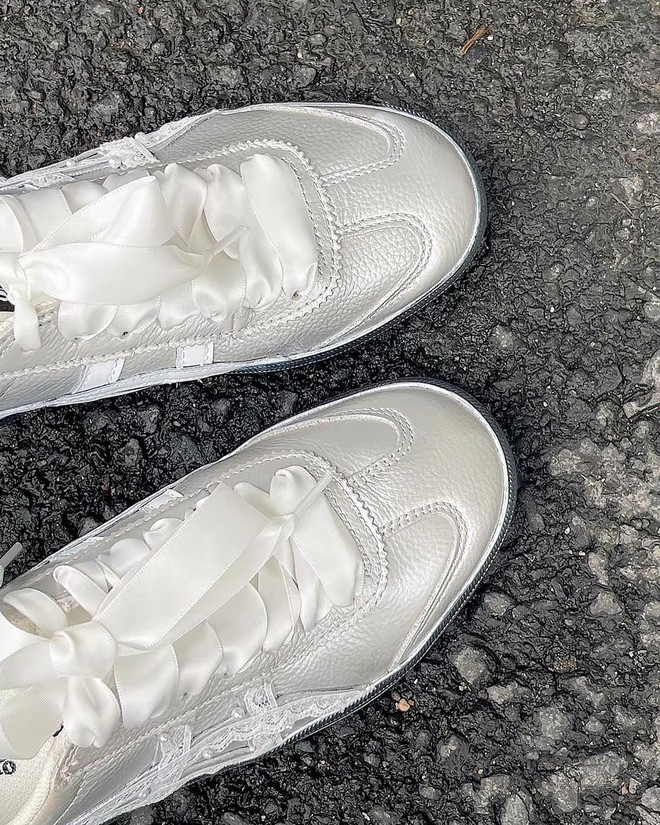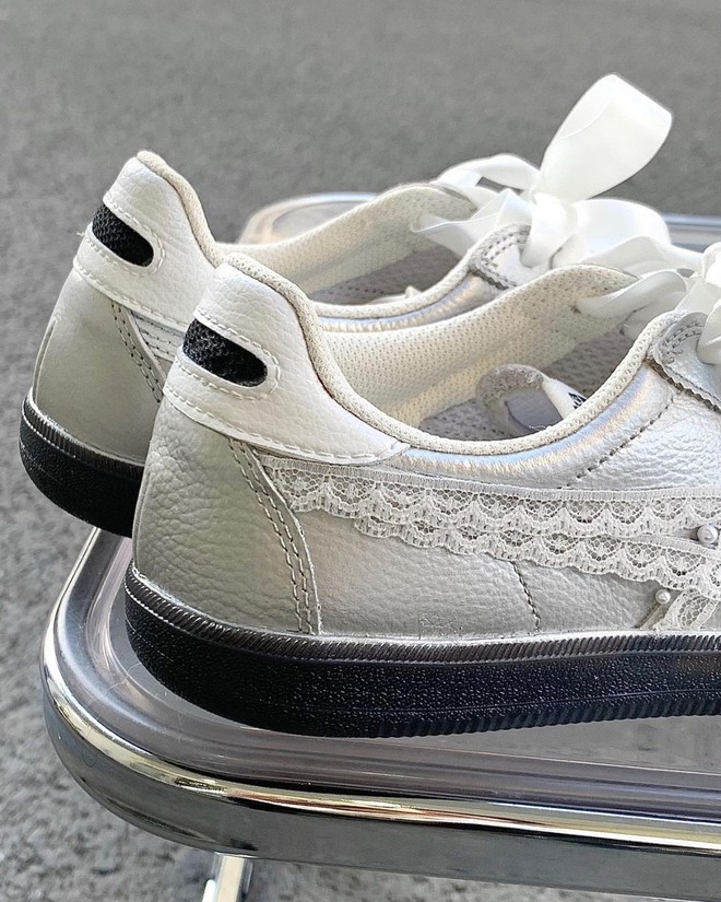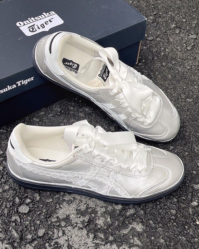 Cũng là motif giày ánh bạc và thêm thắt những chi tiết ren trắng nhưng đại diện nhà Onitsuka Tiger lại có hình hài điệu hơn một chút với phần dây giày ruy băng xinh lịm tim. Dòng Tokuten vốn là một trong những dòng giày chủ đạo của hãng trong vài năm trở lại đây nên không lạ khi phiên bản đặc biệt được custom bởi chính Onitsuka Tiger lại được săn lùng. So với đôi adidas Samba x Wales Bonner thì mẫu này có giá mềm hơn, dao động trong khoảng 5700K - 6500K tại các shop order đồ xách tay.