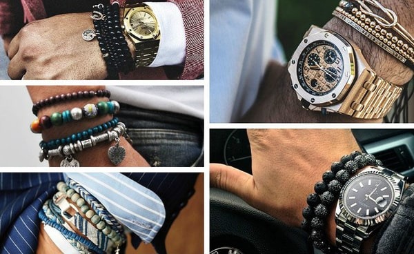 -Nếu chuộng phong cách đa dạng và cá tính hơn, các bạn nam có thể sử dụng hiệu ứng layering - kết hợp nhiều kiểu vòng tay khác nhau, hay kết hợp vòng tay với đồng hồ. Với phong cách này, các bạn có thể kết hợp vừa vòng dây bện, vừa vòng da, chuỗi hạt cùng với đồng hồ.