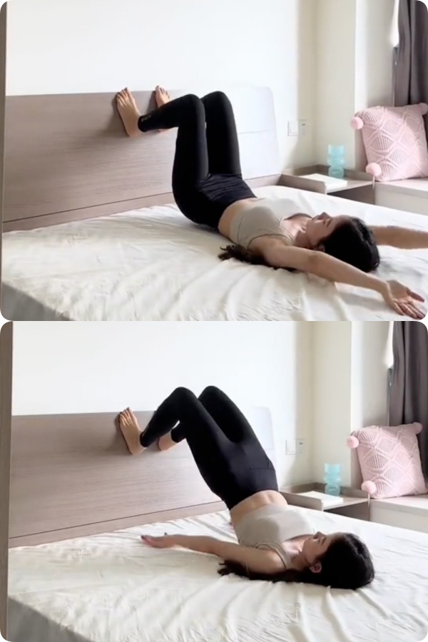 - Bắt đầu với tư thế nằm áp lưng xuống thảm, hai tay đặt xuôi theo thân người. Hai chân kê lên tường.