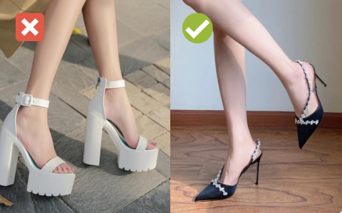 Khi chọn giày cao gót, nàng ''chân voi'' nên tránh những mẫu giày có quai ở cổ chân. Chi tiết tưởng chừng ''vô tri'' này chính là nguyên nhân làm cho đôi chân của bạn trông đồ sộ hơn. Chưa kể, chúng còn khiến bạn trông thấp hơn, chiều dài chân cũng ngắn hơn nhiều. Thay vào đó, bạn cần sắm cho mình 1 đôi giày mũi nhọn và không có quai ở cổ chân. Mẫu giày này sẽ giúp hô biến vóc dáng của nàng thêm cao ráo, đôi chân cũng gọn gàng và thanh thoát hơn.