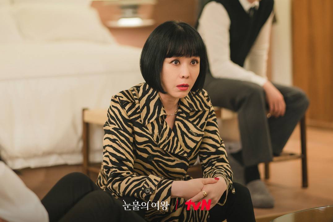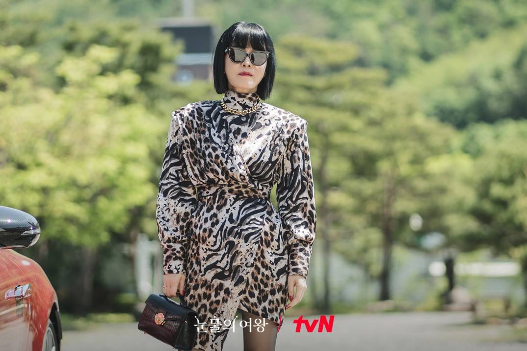 Diện trang phục da báo "lồng lộn" thôi chưa đủ, quý bà Hong Beom Ja còn tô điểm thêm trang sức vàng khiến độ sang chảnh và quyền lực càng tăng thêm bội phần. Điểm ấn tượng là nhân vật Hong Beom Ja rất khéo chọn những thiết kế giúp tôn lên vóc dáng thon gọn, đôi chân siêu nuột nà ở tuổi trung niên.