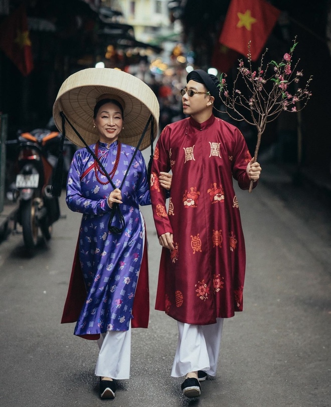 Stylist Hoàng Ku diện Việt Phục với màu sắc rực rỡ, nổi bật kết hợp cùng hoạ tiết thêu tinh xảo, sang trọng của Hoa Niên. Những hình ảnh của anh cùng mẹ trong ngày đầu xuân năm mới khiến cộng đồng mạng vô cùng thích thú