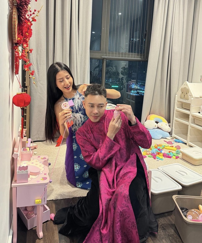 Ngoài ra, Hoàng Ku cũng lựa chọn 2 thiết kế áo dài kiểu dáng truyền thống, đơn giản họa tiết chìm để gặp gỡ bạn bè đầu xuân