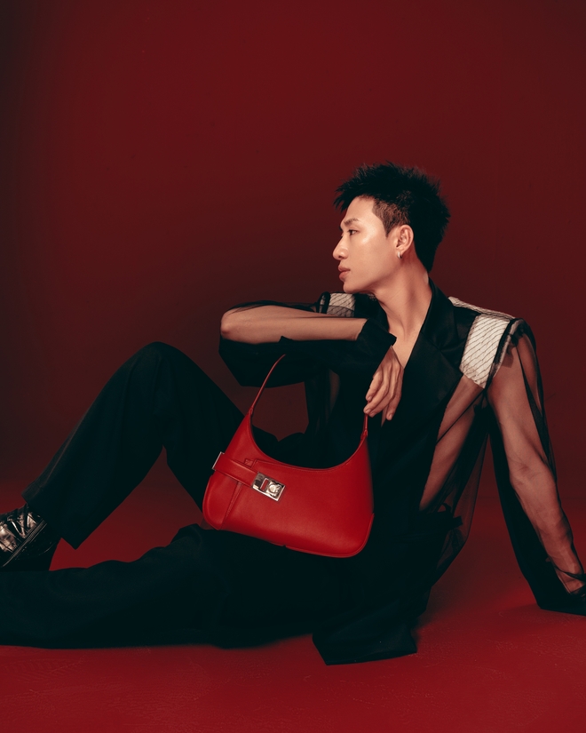 Phạm Bảo Luận cũng lựa chọn sắc đỏ - đen cho Tết Giáp Thìn 2024 trong trang phục được thiết kế cách điệu, hiện đại. Bộ cánh xuyên thấu mang đậm phong cách unisex của anh chàng khiến cộng đồng mạng không khỏi ấn tượng