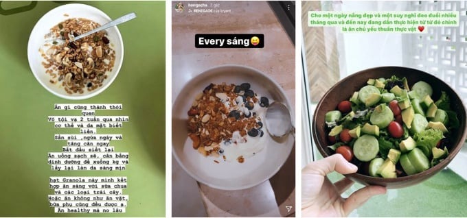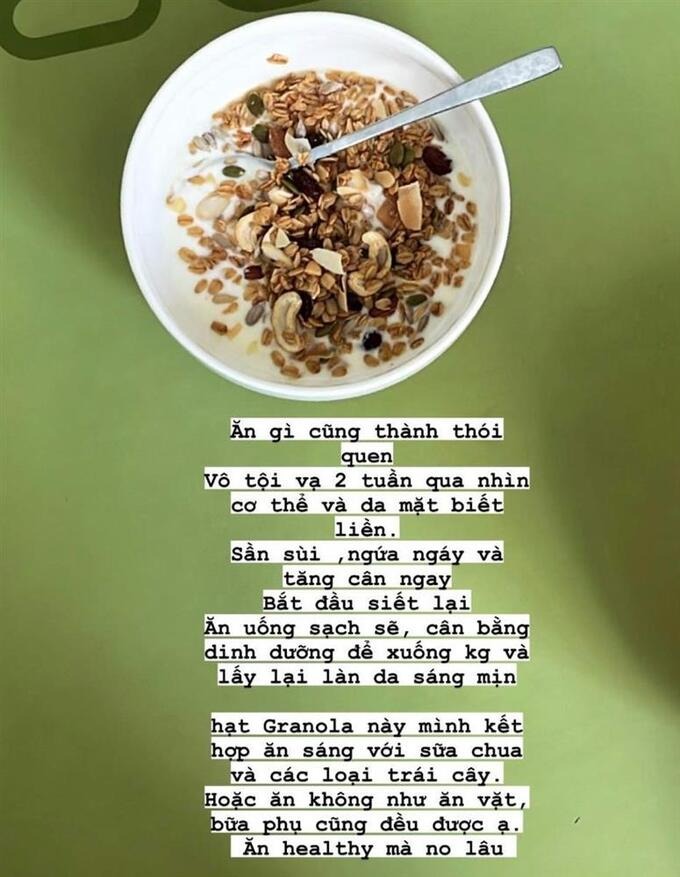 Bắt đầu chế độ siết cân, Hà Hồ chọn ăn granola cùng sữa chua và trái cây. Granola là hỗn hợp của nhiều thực phẩm như hạt dinh dưỡng, trái cây khô, yến mạch… nướng giòn. Chính vì vậy, trong granola có lượng chất xơ dồi dào, tạo cảm giác no lâu, tránh ăn vặt.