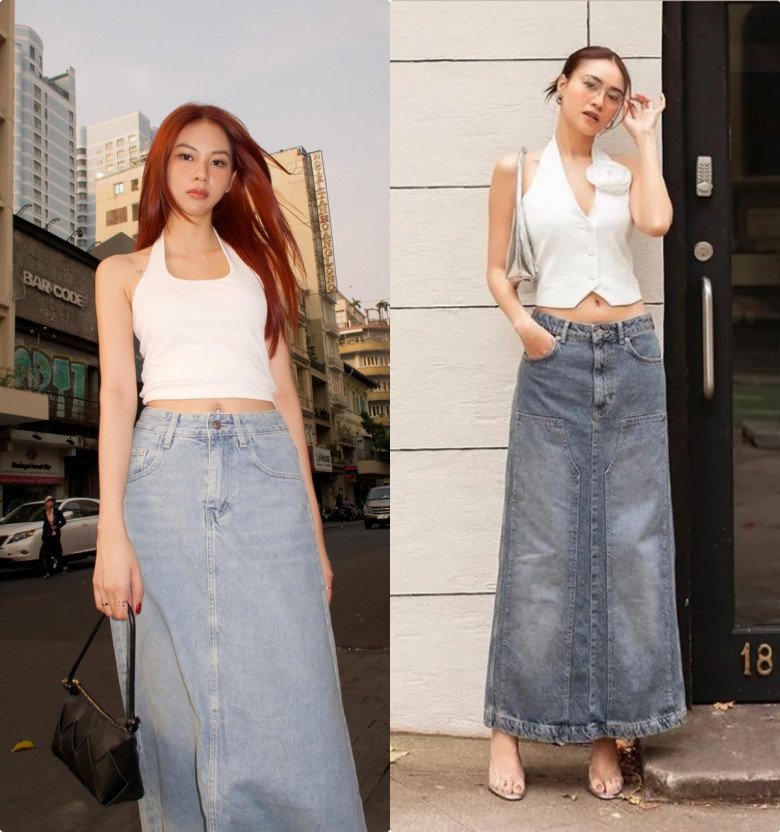 Đây có lẽ là món đồ bạn trông thấy nhiều nhất trên đường phố năm 2023. Chất liệu denim đang là con cưng được các sao sành mặc ưu ái. Item được làm từ chất liệu cứng sẽ giúp cho chân váy đứng dáng. Vì vậy, hội người "nấm lùn" hay bé như kẹo nên cho vào danh sách shopping vì khả năng hack chiều cao cực xịn.