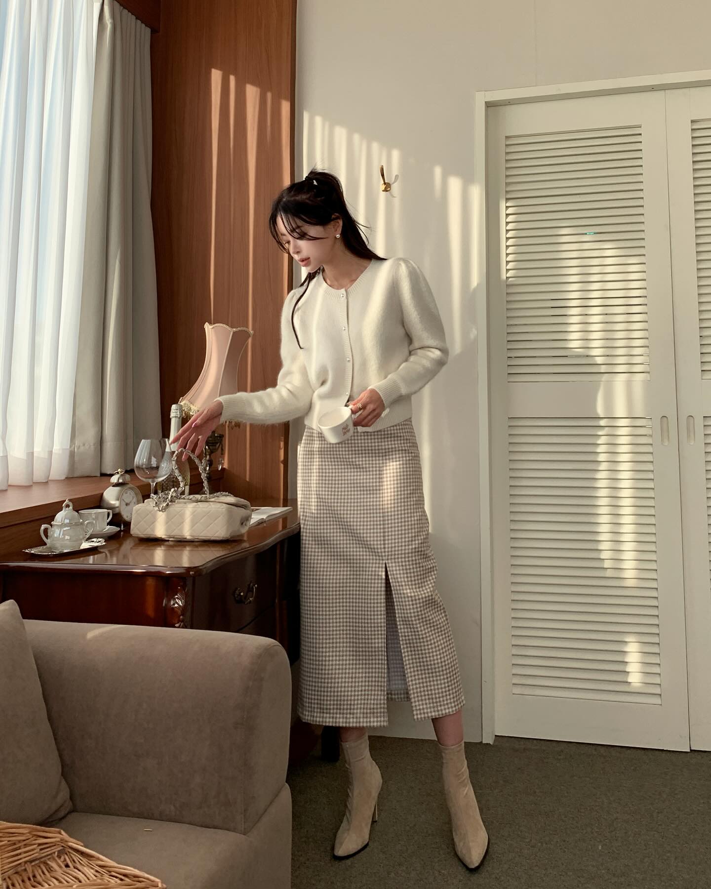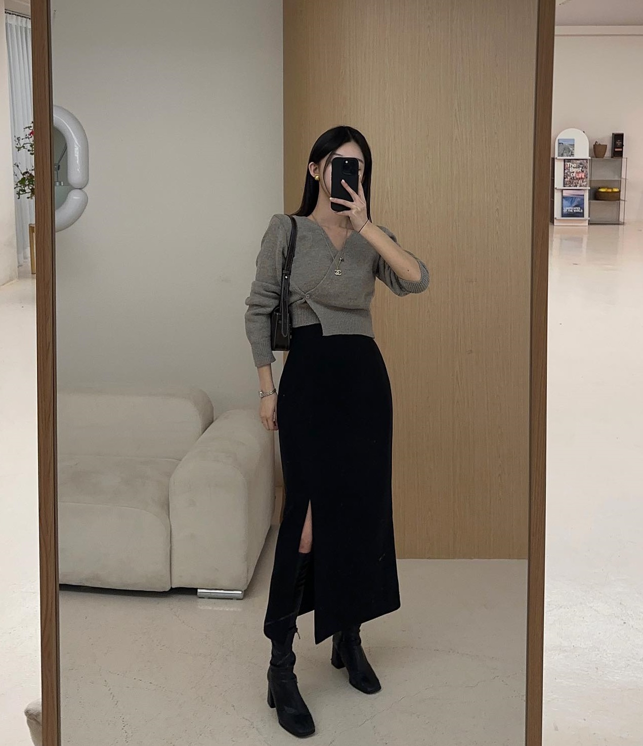 Phiên bản chân váy xẻ tà dễ phối đồ nhất là chân váy đen. Các nàng có thể kết hợp item này với mọi kiểu áo trong tủ đồ để tạo nên tổng thể trang phục sành điệu, hút mắt. Ngoài chân váy đen xẻ tà, những chiếc chân váy họa tiết kẻ hay mang tông màu trung tính cũng rất lý tưởng để bổ sung cho tủ đồ.