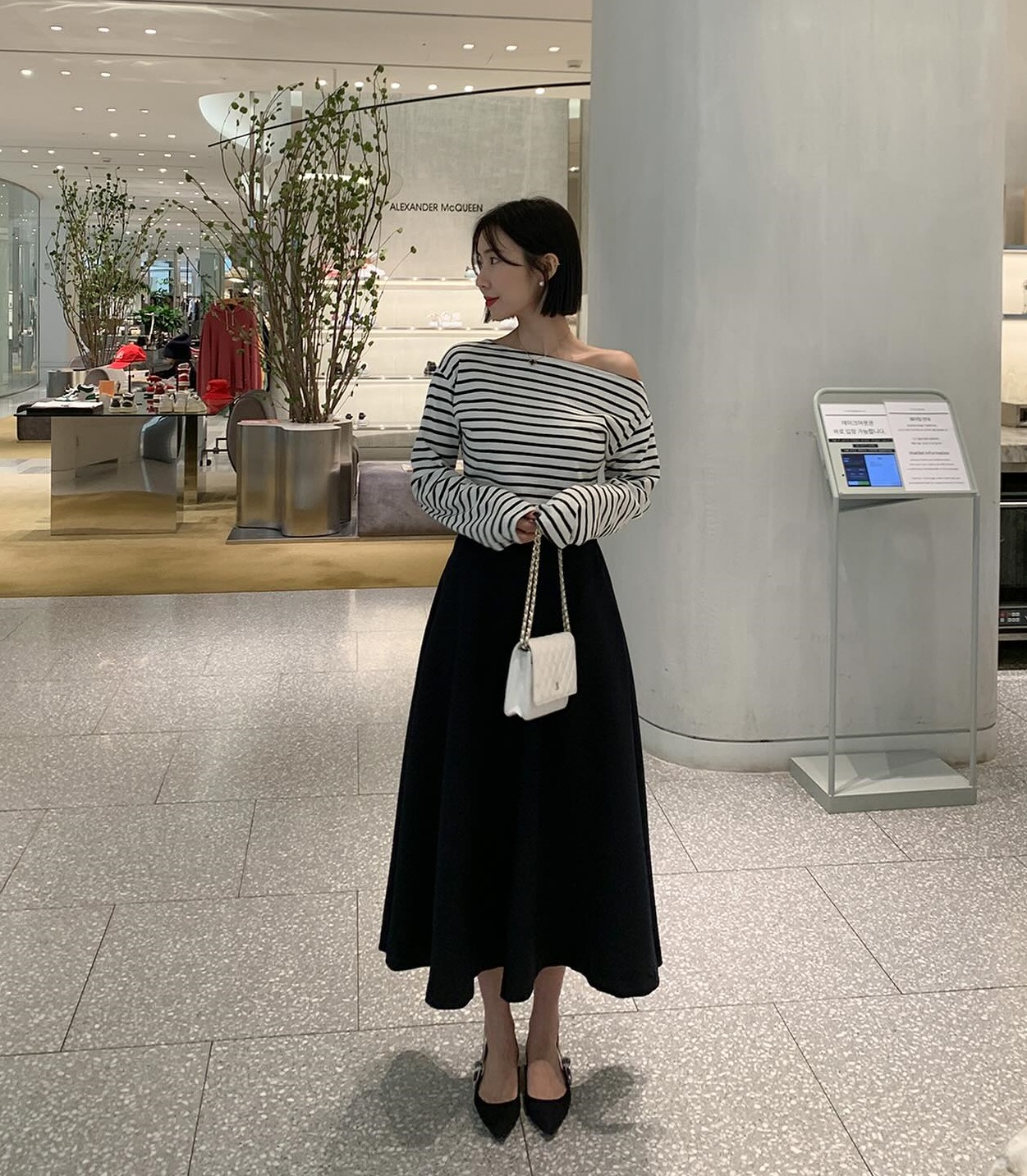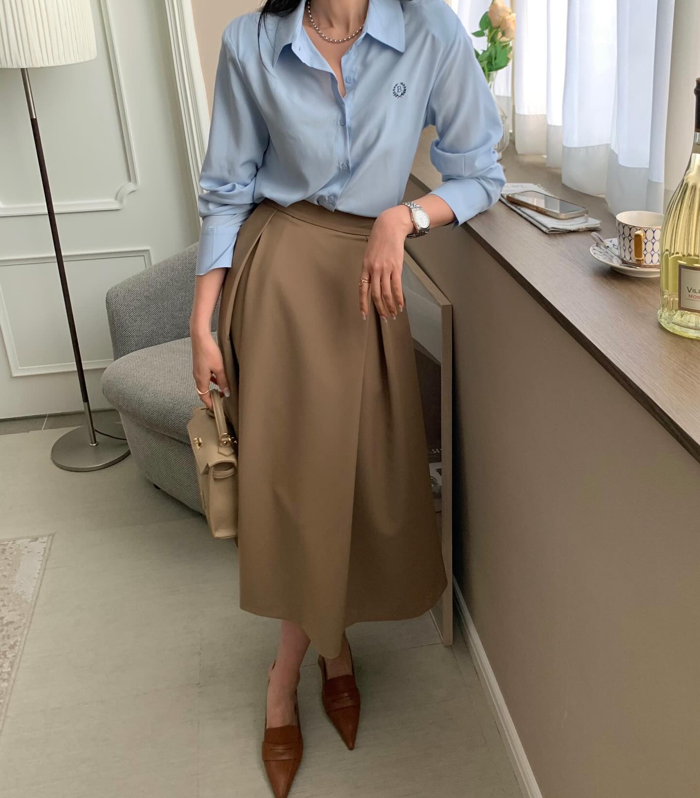 Chân váy chữ A còn có độ bay bổng, nữ tính nhưng cũng không kém phần thanh lịch. Do đó, các nàng có thể tạo nên nhiều set đồ sành điệu từ công sở ra phố với chân váy chữ A. Lưu ý rằng khi diện chân váy chữ A, chị em hãy sơ vin gọn gàng, tô điểm thắt lưng da và đi giày "nịnh" chân để phát huy tối ưu hiệu quả tôn dáng.