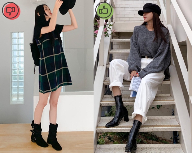 Những kiểu boots dáng rộng hoặc có thêm dây buộc, quai cài trông khá bụi bặm và cá tính. Thế nhưng, khi diện kiểu boots này, vóc dáng của bạn dễ trở nên cồng kềnh, không có được sự thanh thoát. Hơn nữa, boots cầu kỳ còn dễ tạo cảm giác lỗi mốt, "sến sẩm". Xu hướng ở hiện tại là boots trơn màu, thiết kế tinh giản. Chị em có thể dễ dàng kết hợp kiểu boots đơn giản này với mọi kiểu trang phục, từ váy vóc, bộ cánh công sở cho đến các set đồ dạo phố trẻ trung, năng động. Boots đơn giản cũng tôn dáng hiệu quả hơn, nàng có chiều cao khiêm tốn nên lưu tâm.