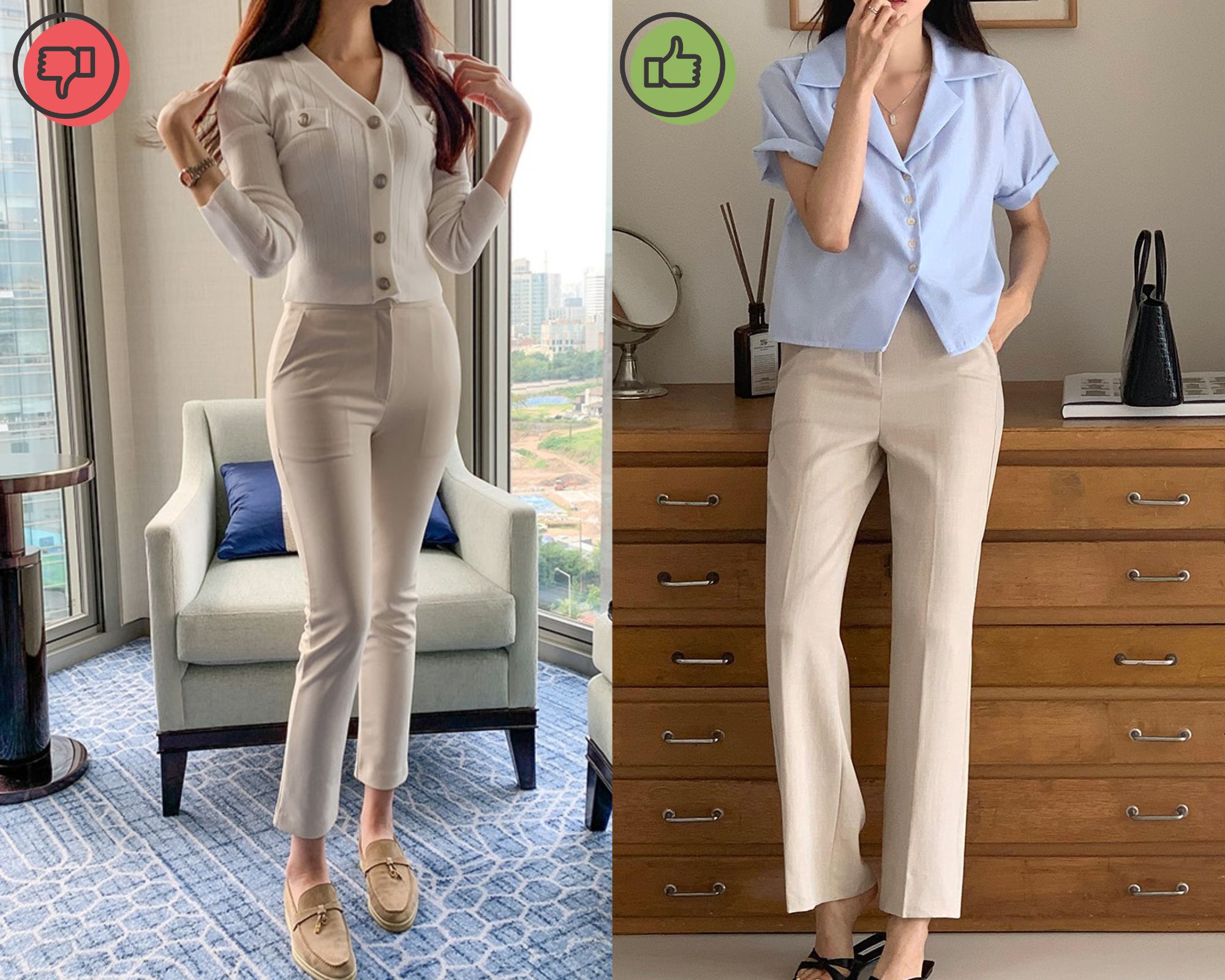 Quần âu ống bó là món thời trang khá kén dáng, dễ để lộ nhược điểm. Ngoài ra, mẫu quần này cũng không còn hợp mốt. Quần âu ống đứng là kiểu trang phục đáng đầu tư hơn. Kiểu quần này mang đến nét hiện đại và trẻ trung cho người diện. Khi chọn quần âu ống đứng, cạp cao và sơ vin gọn gàng, tổng thể còn thêm phần cao ráo, chỉn chu. Các mẫu áo lý tưởng để kết hợp với quần âu ống đứng bao gồm áo thun, áo sơ mi oversized hoặc áo blouse điệu đà, nữ tính.