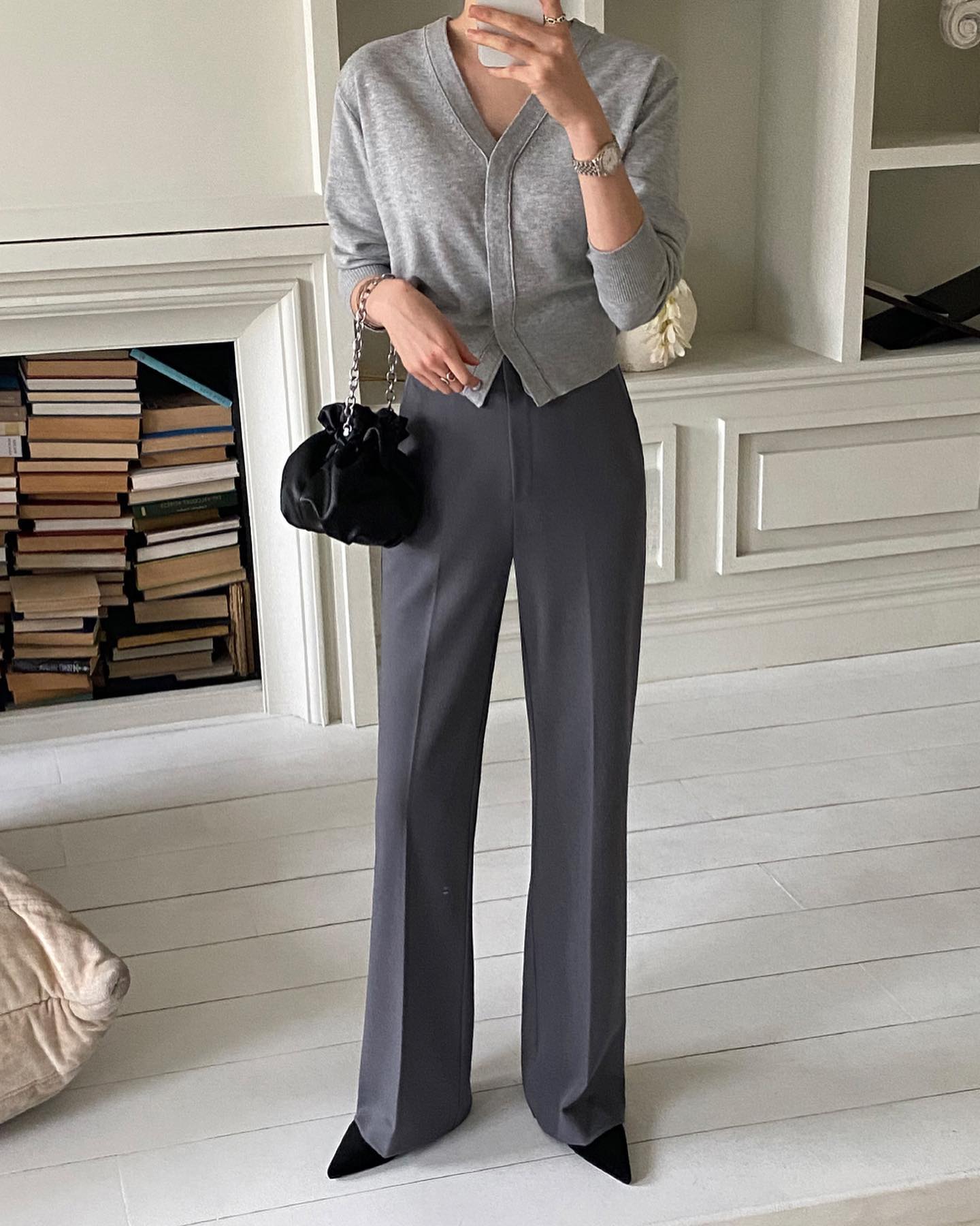 Xu hướng trang phục màu xám đang được yêu thích trong thời gian gần đây. Và để làm mới phong cách, quý cô trên 40 tuổi hãy bổ sung quần âu xám cho tủ đồ. Mẫu quần này mang tông màu trang nhã nhưng vẫn toát lên sự cá tính, thời thượng. Với quần âu xám, các quý cô trên 40 tuổi có thể diện đồ theo cách đơn giản nhất mà vẻ ngoài vẫn ấn tượng, "cool ngầu". Để nâng tầm phong cách và tôn dáng tối đa, các quý cô đừng bỏ qua thao tác sơ vin khi diện quần âu xám.