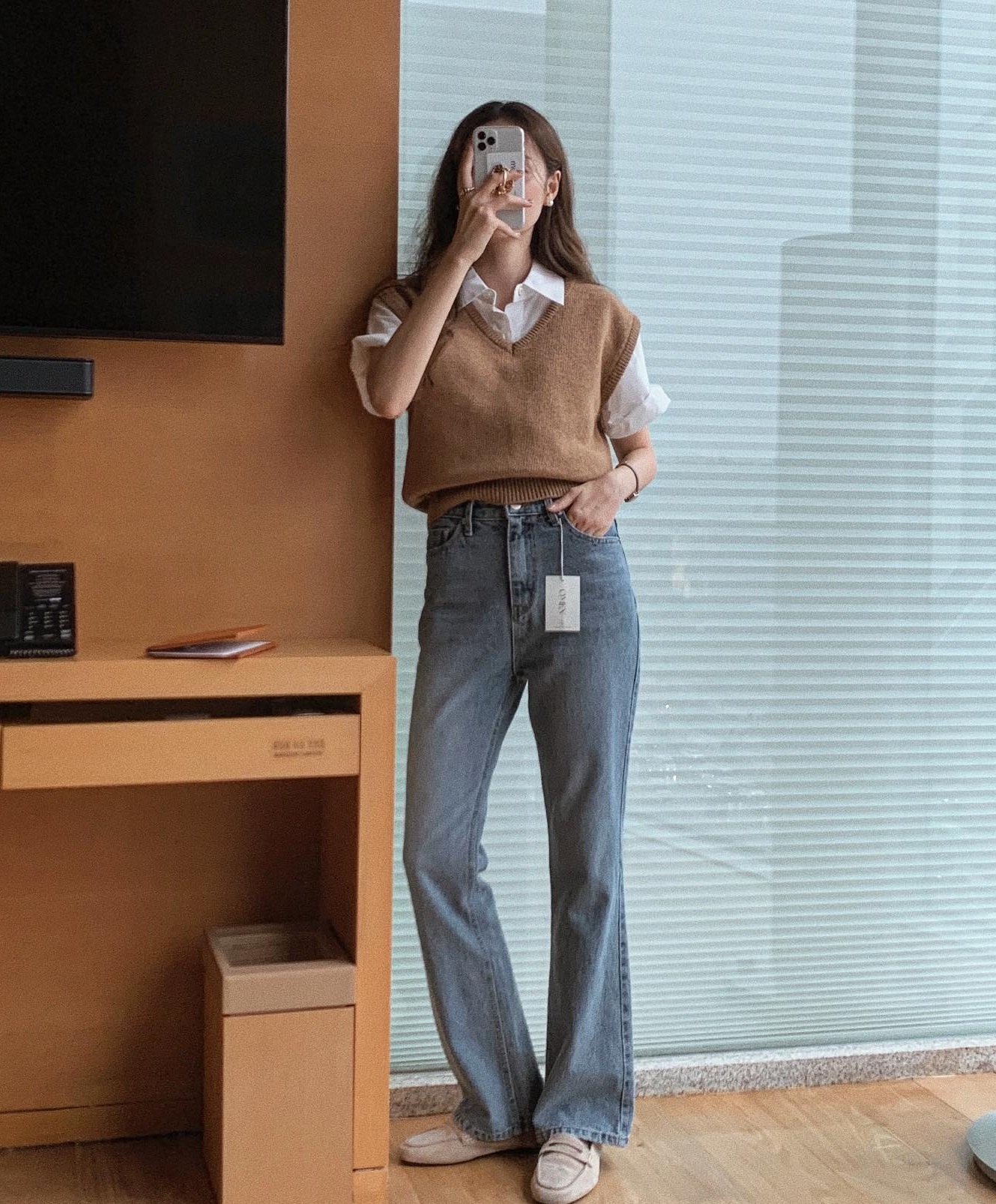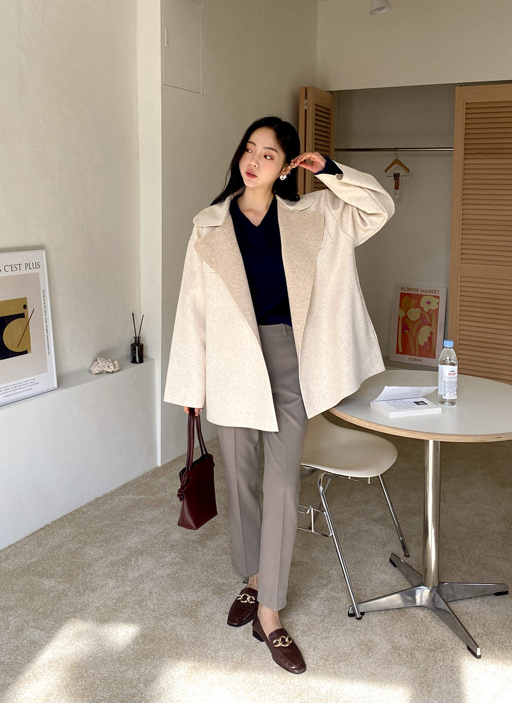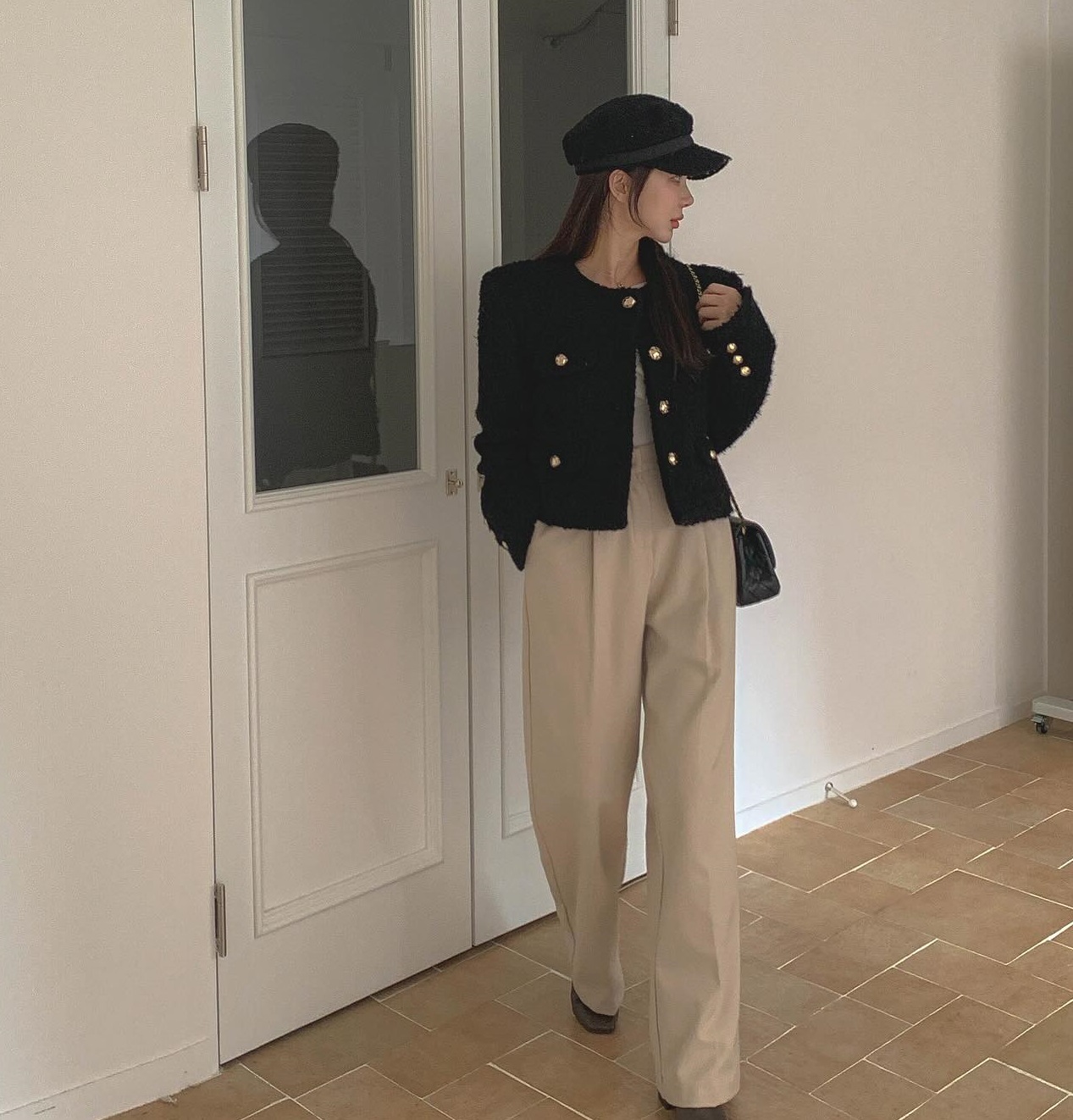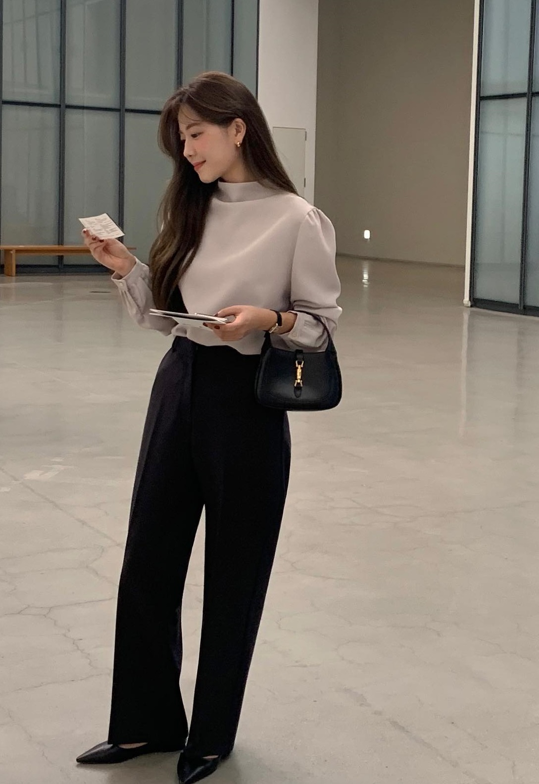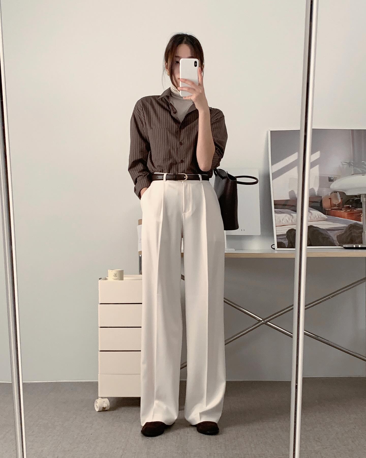 Quần âu ống đứng kết hợp ăn ý với mọi kiểu áo công sở. Tuy nhiên, chị em nên phối mẫu quần dài này cùng áo sơ mi dáng rộng, áo thun hoặc áo len cộc tay để vẻ ngoài thêm trẻ trung, tươi mới. Sơ vin là thao tác không nên bỏ qua khi diện quần ống rộng vì giúp tôn dáng tối ưu và đảm bảo sự thanh lịch.