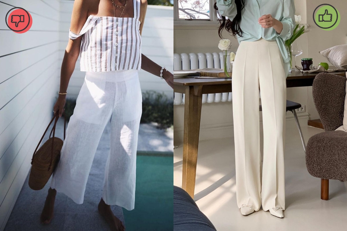 Mùa hè cũng là lúc những mẫu quần có chất vải mỏng nhẹ lên ngôi, tuy nhiên bạn cần lưu ý tránh diện những mẫu quần có chất vải quá mỏng, xuyên thấu. Đặc biệt là những mẫu quần trắng sáng màu, thường sẽ có chất vải mỏng manh, dễ làm lộ nội y bên trong. Khi chọn quần, bạn nên chọn những mẫu có chất vải với độ dày dặn vừa phải, không bị lộ "phụ tùng" khi soi dưới ánh nắng.