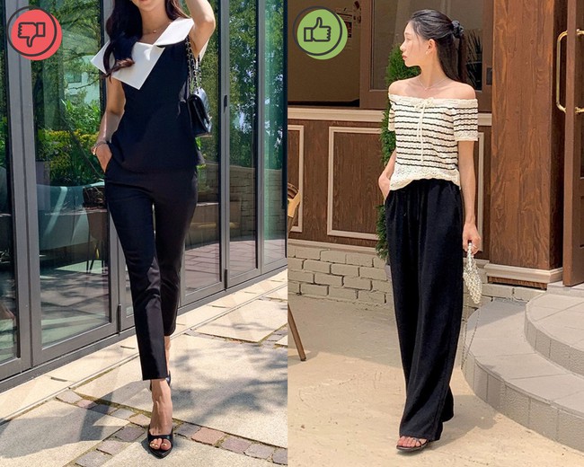 Ngay cả khi bước sang mùa lạnh thì những chiếc quần đen ống rộng thoải mái, sành điệu vẫn được chị em yêu thích. Độ dài của quần đen ống rộng sẽ quyết định đến khả năng tôn dáng của bộ trang phục. Nếu chọn một mẫu quần có độ dài chỉ đến bắp chân, chị em có thể bị "dìm" chiều cao. Hãy ưu tiên quần đen ống rộng có độ dài ngang mắt cá chân. Tiếp đó, chị em hãy đi một đôi giày nịnh dáng như là giày cao gót mũi nhọn, sandal quai mảnh, giày mule hoặc giày màu be. Chỉ đơn giản vậy thôi, vóc dáng sẽ thêm cao ráo, thanh thoát và phong cách cũng trở nên sành điệu hơn.