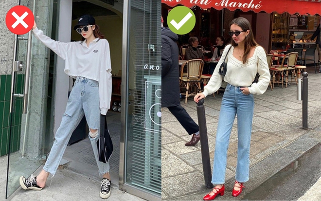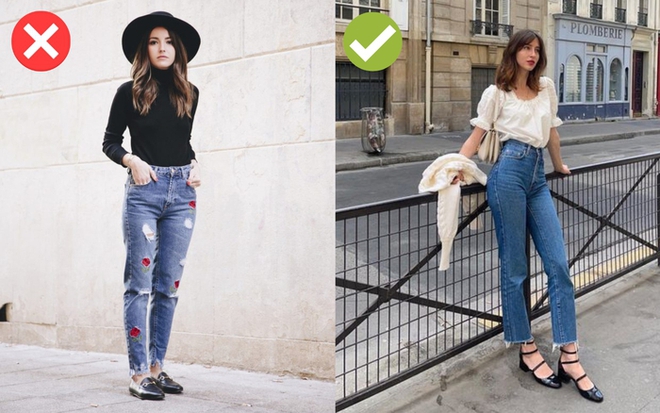 Quần jeans baggy là item được các quý cô sở hữu đôi chân kém thon gọn ưa chuộng. Không thể phủ nhận tính ứng dụng và tinh tế của dáng quần này khi mọi quý cô với mọi vóc dáng đều có thể lựa chọn. Tuy nhiên, khi được nhấn thêm những vết rách to nhỏ khác nhau, những chiếc quần này lại trở nên thiếu tính thời trang, kém lịch sự và thanh lịch. Vì vậy, với những quý cô Pháp ưa sự tinh tế và tao nhã, mẫu quần này hoàn toàn không còn là sự lựa chọn sáng suốt.