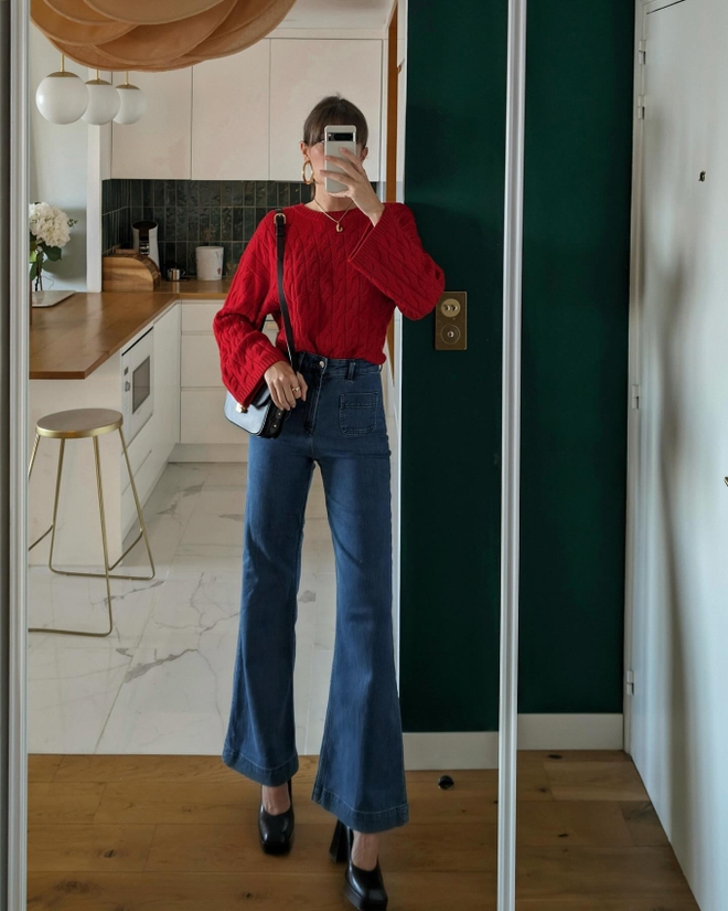 Quần jeans ống loe rất nổi bật và còn mang đến cho người diện vẻ ngoài sang trọng. Kiểu quần này được các quý cô người Pháp diện từ năm này qua năm khác vì nó không bao giờ lỗi mốt. Quần jeans ống loe mang đến hiệu quả thu gọn đôi chân và "ăn gian" chiều cao. Tuy nhiên, chị em cần sơ vin để phát huy tối ưu công dụng tôn dáng của kiểu quần này. Muốn phong cách trong năm mới thêm nổi bật, ấn tượng, chị em rất nên bổ sung quần jeans ống loe cho tủ đồ.