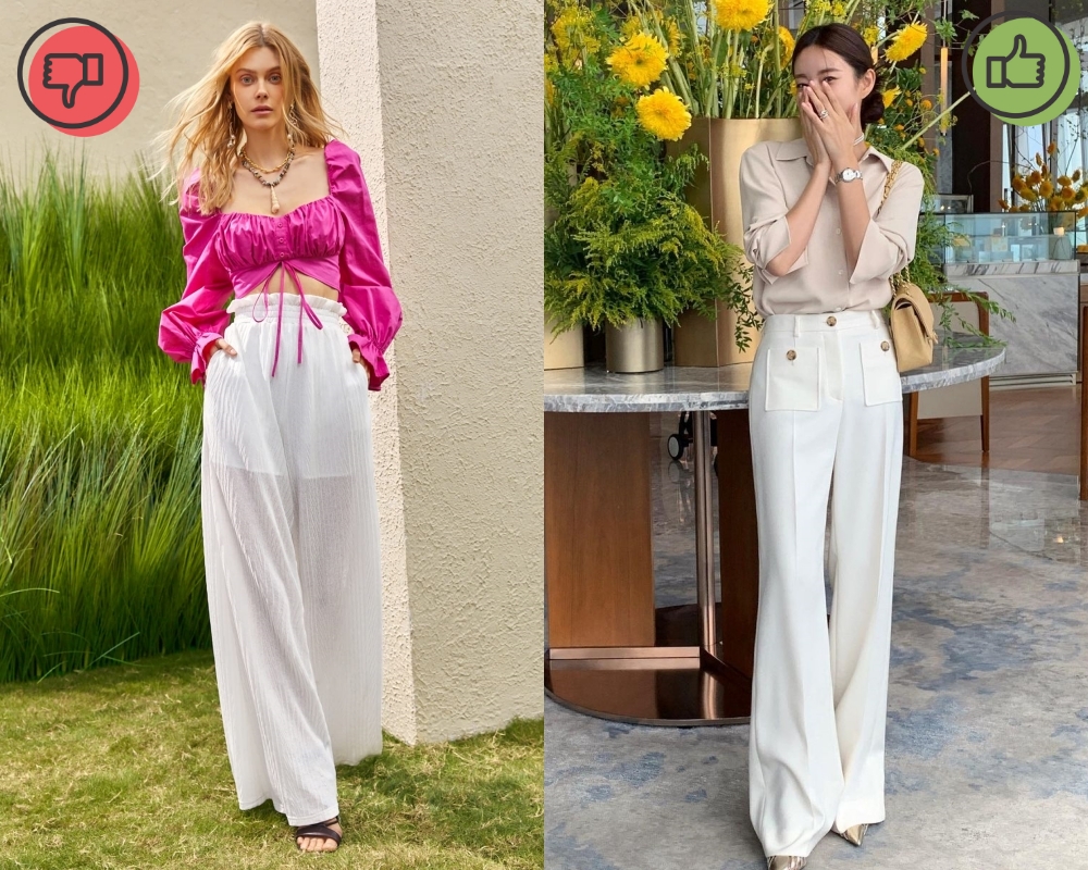 Quần với chất liệu vải mỏng không phải là item phù hợp khi diện đến văn phòng. Quần có chất vải quá mỏng có thể làm lộ nội y bên trong, và đồng thời cũng mất đi vẻ chuyên nghiệp của bạn trong công việc. Mặc dù có 1 số loại quần vải mỏng trông rất thời thượng và quyến rũ nhưng bạn chỉ nên diện chúng trong những buổi tiệc, dạo phố hoặc đi du lịch mà thôi. Còn khi đến sở làm, bạn vẫn nên chọn những mẫu quần có chất vải kín đáo, form dáng cứng cáp.