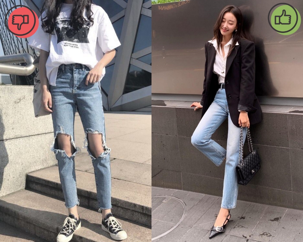 Quần jeans rách, dù có thể phổ biến trong cuộc sống hàng ngày nhưng lại không phải là lựa chọn thích hợp cho công sở. Những lỗ rách của quần jeans tuy trông rất bụi bặm và cá tính nhưng đồng thời cũng làm mất đi sự chuyên nghiệp và chỉn chu của bạn. Thay vào quần jeans rách, bạn nên ưu tiên những kiểu quần jeans trơn với tông màu và kiểu dáng trang nhã hơn.