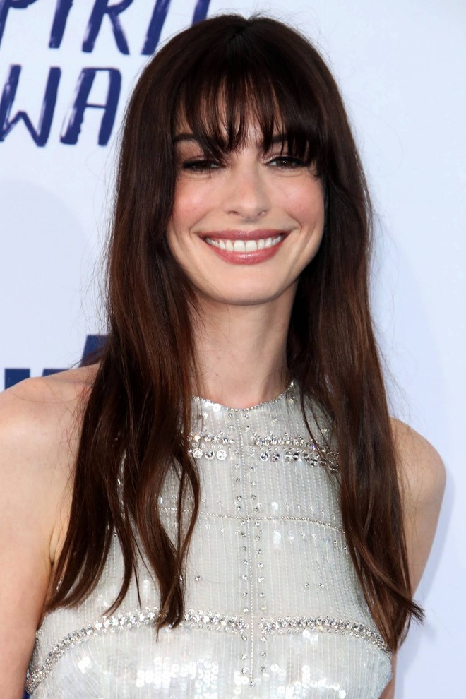 Anne Hathaway thường xuyên áp dụng kiểu tóc dài mái thưa. Style tóc này mang đến nét trẻ trung, ngọt ngào cho Anne Hathaway. Bên cạnh đó, tóc dài mái thưa cũng không hề "lạc quẻ" so với tuổi ngoài 40. Phần mái thưa còn có tác dụng khắc phục nhược điểm, tạo hiệu ứng gương mặt thanh thoát hơn. Khi áp dụng kiểu tóc dài mái thưa, Anne Hathaway nhuộm màu nâu hạt dẻ để vẻ ngoài thêm rạng rỡ và "hack" tuổi hiệu quả hơn.